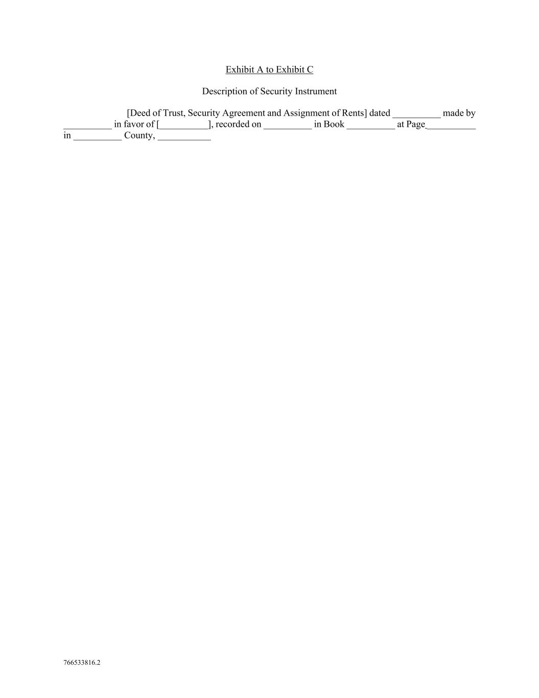 766533816.2 Exhibit A to Exhibit C Description of Security Instrument [Deed of Trust, Security Agreement and Assignment of Rents] dated __________ made by __________ in favor of [__________], recorded on __________ in Book __________ at Page __________ in __________ County, ___________