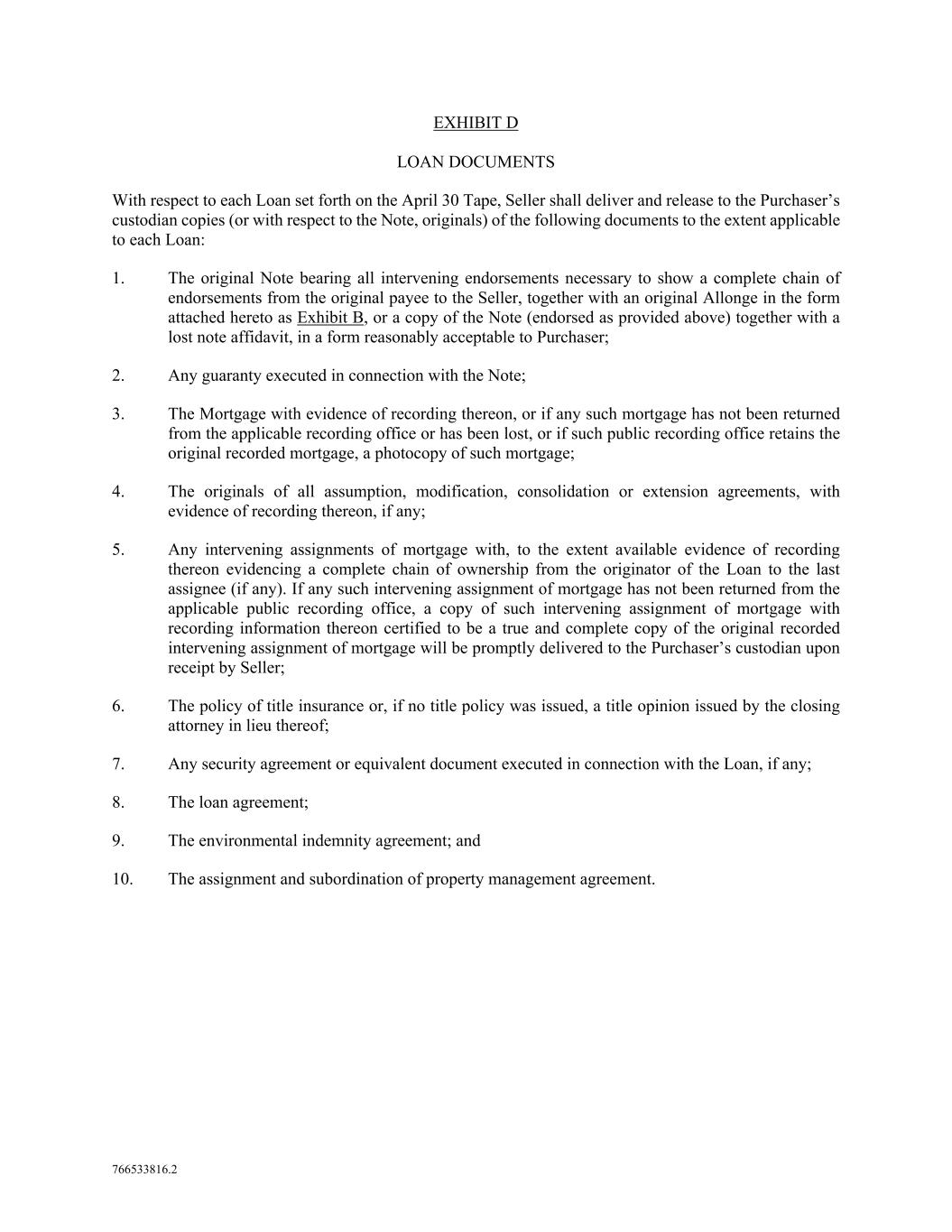 766533816.2 EXHIBIT D LOAN DOCUMENTS With respect to each Loan set forth on the April 30 Tape, Seller shall deliver and release to the Purchaser’s custodian copies (or with respect to the Note, originals) of the following documents to the extent applicable to each Loan: 1. The original Note bearing all intervening endorsements necessary to show a complete chain of endorsements from the original payee to the Seller, together with an original Allonge in the form attached hereto as Exhibit B, or a copy of the Note (endorsed as provided above) together with a lost note affidavit, in a form reasonably acceptable to Purchaser; 2. Any guaranty executed in connection with the Note; 3. The Mortgage with evidence of recording thereon, or if any such mortgage has not been returned from the applicable recording office or has been lost, or if such public recording office retains the original recorded mortgage, a photocopy of such mortgage; 4. The originals of all assumption, modification, consolidation or extension agreements, with evidence of recording thereon, if any; 5. Any intervening assignments of mortgage with, to the extent available evidence of recording thereon evidencing a complete chain of ownership from the originator of the Loan to the last assignee (if any). If any such intervening assignment of mortgage has not been returned from the applicable public recording office, a copy of such intervening assignment of mortgage with recording information thereon certified to be a true and complete copy of the original recorded intervening assignment of mortgage will be promptly delivered to the Purchaser’s custodian upon receipt by Seller; 6. The policy of title insurance or, if no title policy was issued, a title opinion issued by the closing attorney in lieu thereof; 7. Any security agreement or equivalent document executed in connection with the Loan, if any; 8. The loan agreement; 9. The environmental indemnity agreement; and 10. The assignment and subordination of property management agreement.