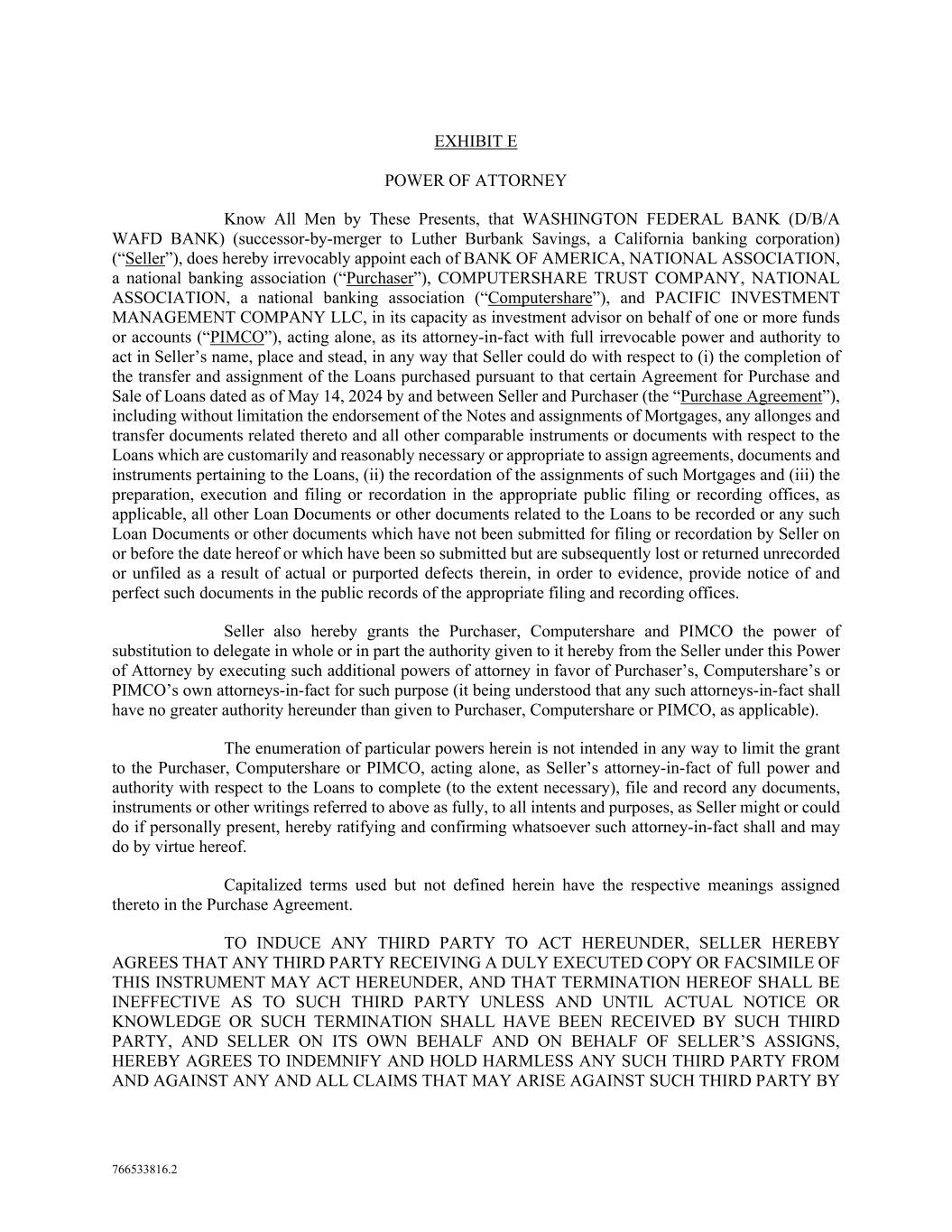 766533816.2 EXHIBIT E POWER OF ATTORNEY Know All Men by These Presents, that WASHINGTON FEDERAL BANK (D/B/A WAFD BANK) (successor-by-merger to Luther Burbank Savings, a California banking corporation) (“Seller”), does hereby irrevocably appoint each of BANK OF AMERICA, NATIONAL ASSOCIATION, a national banking association (“Purchaser”), COMPUTERSHARE TRUST COMPANY, NATIONAL ASSOCIATION, a national banking association (“Computershare”), and PACIFIC INVESTMENT MANAGEMENT COMPANY LLC, in its capacity as investment advisor on behalf of one or more funds or accounts (“PIMCO”), acting alone, as its attorney-in-fact with full irrevocable power and authority to act in Seller’s name, place and stead, in any way that Seller could do with respect to (i) the completion of the transfer and assignment of the Loans purchased pursuant to that certain Agreement for Purchase and Sale of Loans dated as of May 14, 2024 by and between Seller and Purchaser (the “Purchase Agreement”), including without limitation the endorsement of the Notes and assignments of Mortgages, any allonges and transfer documents related thereto and all other comparable instruments or documents with respect to the Loans which are customarily and reasonably necessary or appropriate to assign agreements, documents and instruments pertaining to the Loans, (ii) the recordation of the assignments of such Mortgages and (iii) the preparation, execution and filing or recordation in the appropriate public filing or recording offices, as applicable, all other Loan Documents or other documents related to the Loans to be recorded or any such Loan Documents or other documents which have not been submitted for filing or recordation by Seller on or before the date hereof or which have been so submitted but are subsequently lost or returned unrecorded or unfiled as a result of actual or purported defects therein, in order to evidence, provide notice of and perfect such documents in the public records of the appropriate filing and recording offices. Seller also hereby grants the Purchaser, Computershare and PIMCO the power of substitution to delegate in whole or in part the authority given to it hereby from the Seller under this Power of Attorney by executing such additional powers of attorney in favor of Purchaser’s, Computershare’s or PIMCO’s own attorneys-in-fact for such purpose (it being understood that any such attorneys-in-fact shall have no greater authority hereunder than given to Purchaser, Computershare or PIMCO, as applicable). The enumeration of particular powers herein is not intended in any way to limit the grant to the Purchaser, Computershare or PIMCO, acting alone, as Seller’s attorney-in-fact of full power and authority with respect to the Loans to complete (to the extent necessary), file and record any documents, instruments or other writings referred to above as fully, to all intents and purposes, as Seller might or could do if personally present, hereby ratifying and confirming whatsoever such attorney-in-fact shall and may do by virtue hereof. Capitalized terms used but not defined herein have the respective meanings assigned thereto in the Purchase Agreement. TO INDUCE ANY THIRD PARTY TO ACT HEREUNDER, SELLER HEREBY AGREES THAT ANY THIRD PARTY RECEIVING A DULY EXECUTED COPY OR FACSIMILE OF THIS INSTRUMENT MAY ACT HEREUNDER, AND THAT TERMINATION HEREOF SHALL BE INEFFECTIVE AS TO SUCH THIRD PARTY UNLESS AND UNTIL ACTUAL NOTICE OR KNOWLEDGE OR SUCH TERMINATION SHALL HAVE BEEN RECEIVED BY SUCH THIRD PARTY, AND SELLER ON ITS OWN BEHALF AND ON BEHALF OF SELLER’S ASSIGNS, HEREBY AGREES TO INDEMNIFY AND HOLD HARMLESS ANY SUCH THIRD PARTY FROM AND AGAINST ANY AND ALL CLAIMS THAT MAY ARISE AGAINST SUCH THIRD PARTY BY