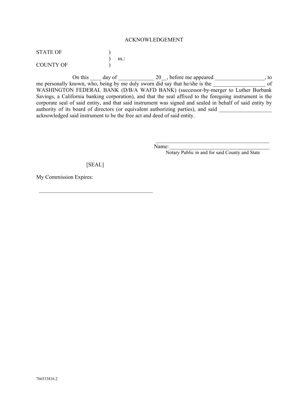766533816.2 ACKNOWLEDGEMENT STATE OF ) ) ss.: COUNTY OF ) On this ____ day of _____________ 20__, before me appeared __________________, to me personally known, who, being by me duly sworn did say that he/she is the ___________________ of WASHINGTON FEDERAL BANK (D/B/A WAFD BANK) (successor-by-merger to Luther Burbank Savings, a California banking corporation), and that the seal affixed to the foregoing instrument is the corporate seal of said entity, and that said instrument was signed and sealed in behalf of said entity by authority of its board of directors (or equivalent authorizing parties), and said ___________________ acknowledged said instrument to be the free act and deed of said entity. _________________________________________ Name: ____________________________________ Notary Public in and for said County and State [SEAL] My Commission Expires: _________________________________________