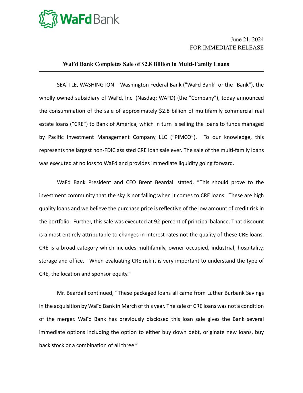 June 21, 2024 FOR IMMEDIATE RELEASE WaFd Bank Completes Sale of $2.8 Billion in Multi-Family Loans SEATTLE, WASHINGTON – Washington Federal Bank ("WaFd Bank" or the "Bank"), the wholly owned subsidiary of WaFd, Inc. (Nasdaq: WAFD) (the "Company"), today announced the consummation of the sale of approximately $2.8 billion of multifamily commercial real estate loans (“CRE”) to Bank of America, which in turn is selling the loans to funds managed by Pacific Investment Management Company LLC (“PIMCO”). To our knowledge, this represents the largest non-FDIC assisted CRE loan sale ever. The sale of the multi-family loans was executed at no loss to WaFd and provides immediate liquidity going forward. WaFd Bank President and CEO Brent Beardall stated, “This should prove to the investment community that the sky is not falling when it comes to CRE loans. These are high quality loans and we believe the purchase price is reflective of the low amount of credit risk in the portfolio. Further, this sale was executed at 92-percent of principal balance. That discount is almost entirely attributable to changes in interest rates not the quality of these CRE loans. CRE is a broad category which includes multifamily, owner occupied, industrial, hospitality, storage and office. When evaluating CRE risk it is very important to understand the type of CRE, the location and sponsor equity.” Mr. Beardall continued, “These packaged loans all came from Luther Burbank Savings in the acquisition by WaFd Bank in March of this year. The sale of CRE loans was not a condition of the merger. WaFd Bank has previously disclosed this loan sale gives the Bank several immediate options including the option to either buy down debt, originate new loans, buy back stock or a combination of all three.”