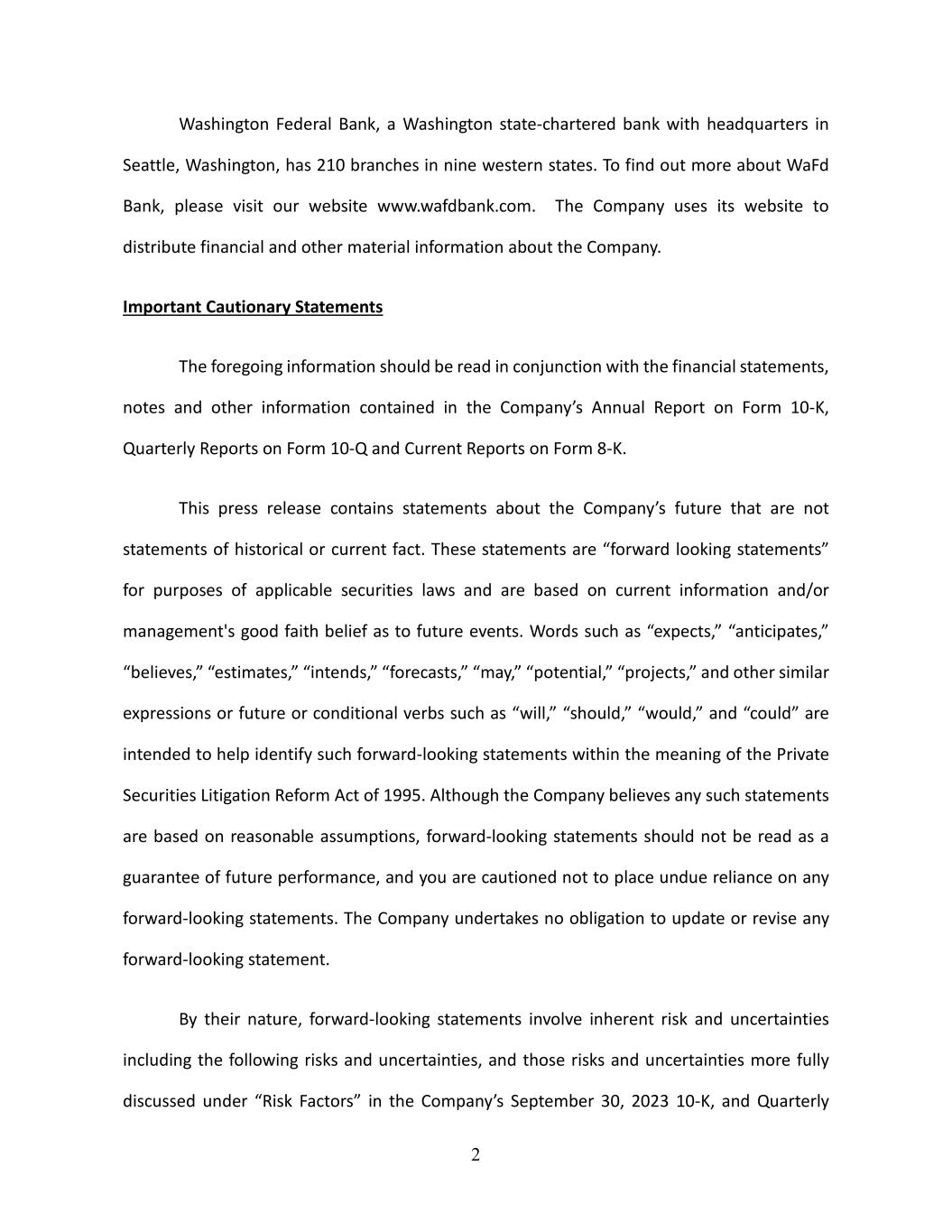 2 Washington Federal Bank, a Washington state-chartered bank with headquarters in Seattle, Washington, has 210 branches in nine western states. To find out more about WaFd Bank, please visit our website www.wafdbank.com. The Company uses its website to distribute financial and other material information about the Company. Important Cautionary Statements The foregoing information should be read in conjunction with the financial statements, notes and other information contained in the Company’s Annual Report on Form 10-K, Quarterly Reports on Form 10-Q and Current Reports on Form 8-K. This press release contains statements about the Company’s future that are not statements of historical or current fact. These statements are “forward looking statements” for purposes of applicable securities laws and are based on current information and/or management's good faith belief as to future events. Words such as “expects,” “anticipates,” “believes,” “estimates,” “intends,” “forecasts,” “may,” “potential,” “projects,” and other similar expressions or future or conditional verbs such as “will,” “should,” “would,” and “could” are intended to help identify such forward-looking statements within the meaning of the Private Securities Litigation Reform Act of 1995. Although the Company believes any such statements are based on reasonable assumptions, forward-looking statements should not be read as a guarantee of future performance, and you are cautioned not to place undue reliance on any forward-looking statements. The Company undertakes no obligation to update or revise any forward-looking statement. By their nature, forward-looking statements involve inherent risk and uncertainties including the following risks and uncertainties, and those risks and uncertainties more fully discussed under “Risk Factors” in the Company’s September 30, 2023 10-K, and Quarterly