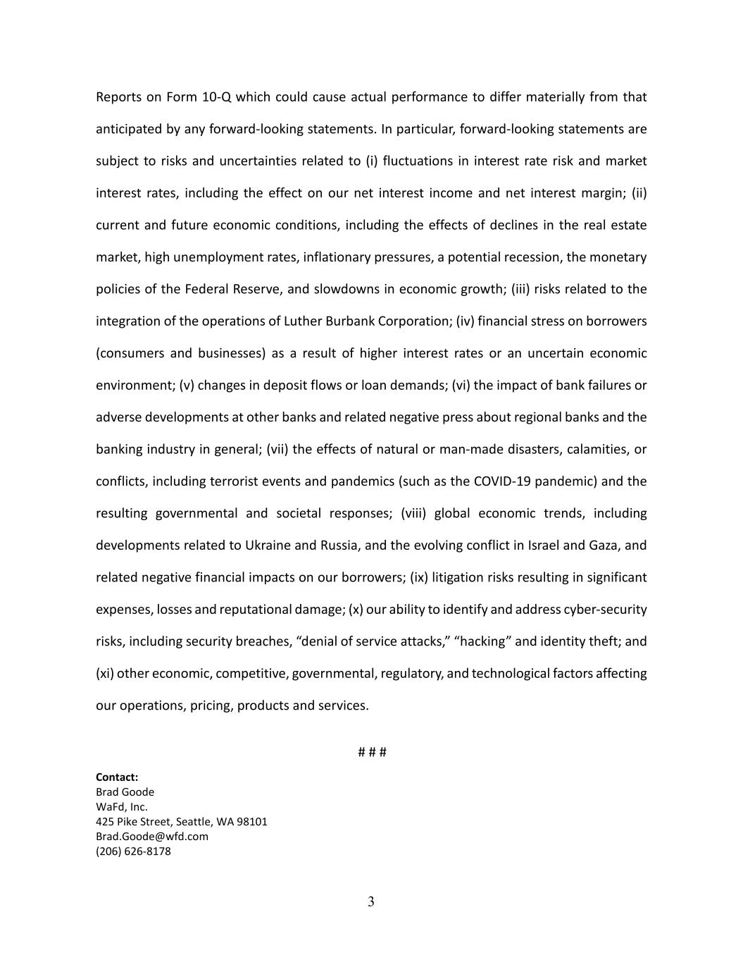 3 Reports on Form 10-Q which could cause actual performance to differ materially from that anticipated by any forward-looking statements. In particular, forward-looking statements are subject to risks and uncertainties related to (i) fluctuations in interest rate risk and market interest rates, including the effect on our net interest income and net interest margin; (ii) current and future economic conditions, including the effects of declines in the real estate market, high unemployment rates, inflationary pressures, a potential recession, the monetary policies of the Federal Reserve, and slowdowns in economic growth; (iii) risks related to the integration of the operations of Luther Burbank Corporation; (iv) financial stress on borrowers (consumers and businesses) as a result of higher interest rates or an uncertain economic environment; (v) changes in deposit flows or loan demands; (vi) the impact of bank failures or adverse developments at other banks and related negative press about regional banks and the banking industry in general; (vii) the effects of natural or man-made disasters, calamities, or conflicts, including terrorist events and pandemics (such as the COVID-19 pandemic) and the resulting governmental and societal responses; (viii) global economic trends, including developments related to Ukraine and Russia, and the evolving conflict in Israel and Gaza, and related negative financial impacts on our borrowers; (ix) litigation risks resulting in significant expenses, losses and reputational damage; (x) our ability to identify and address cyber-security risks, including security breaches, “denial of service attacks,” “hacking” and identity theft; and (xi) other economic, competitive, governmental, regulatory, and technological factors affecting our operations, pricing, products and services. # # # Contact: Brad Goode WaFd, Inc. 425 Pike Street, Seattle, WA 98101 Brad.Goode@wfd.com (206) 626-8178