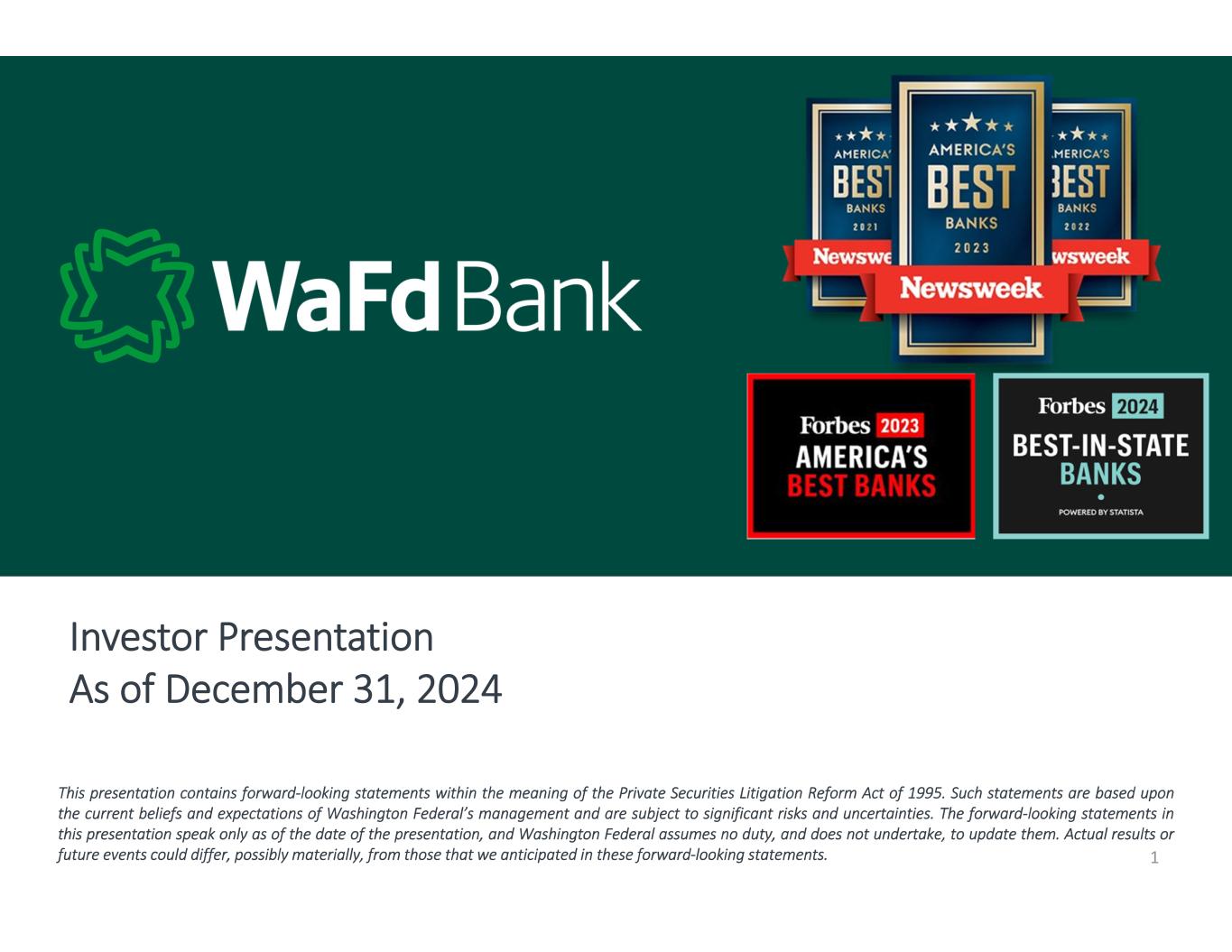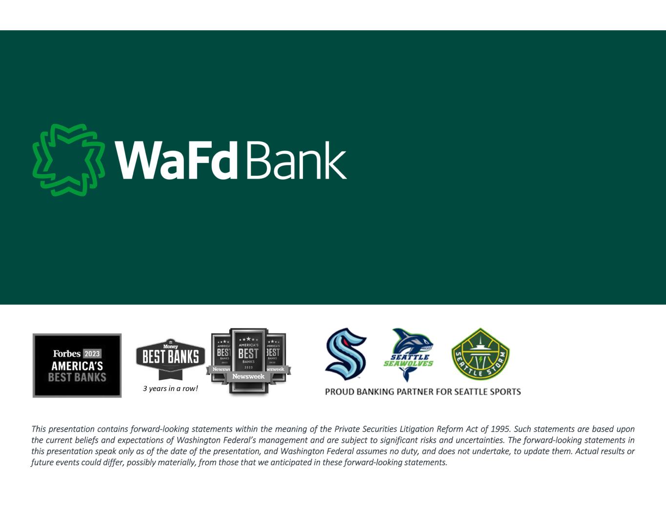 This presentation contains forward‐looking statements within the meaning of the Private Securities Litigation Reform Act of 1995. Such statements are based upon the current beliefs and expectations of Washington Federal’s management and are subject to significant risks and uncertainties. The forward‐looking statements in this presentation speak only as of the date of the presentation, and Washington Federal assumes no duty, and does not undertake, to update them. Actual results or future events could differ, possibly materially, from those that we anticipated in these forward‐looking statements.