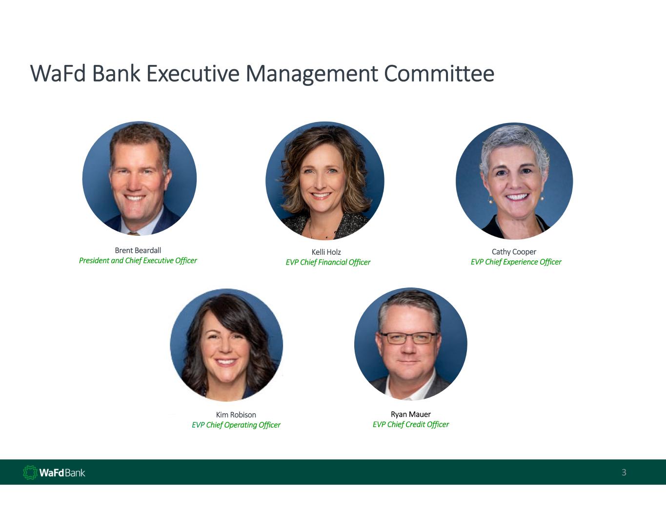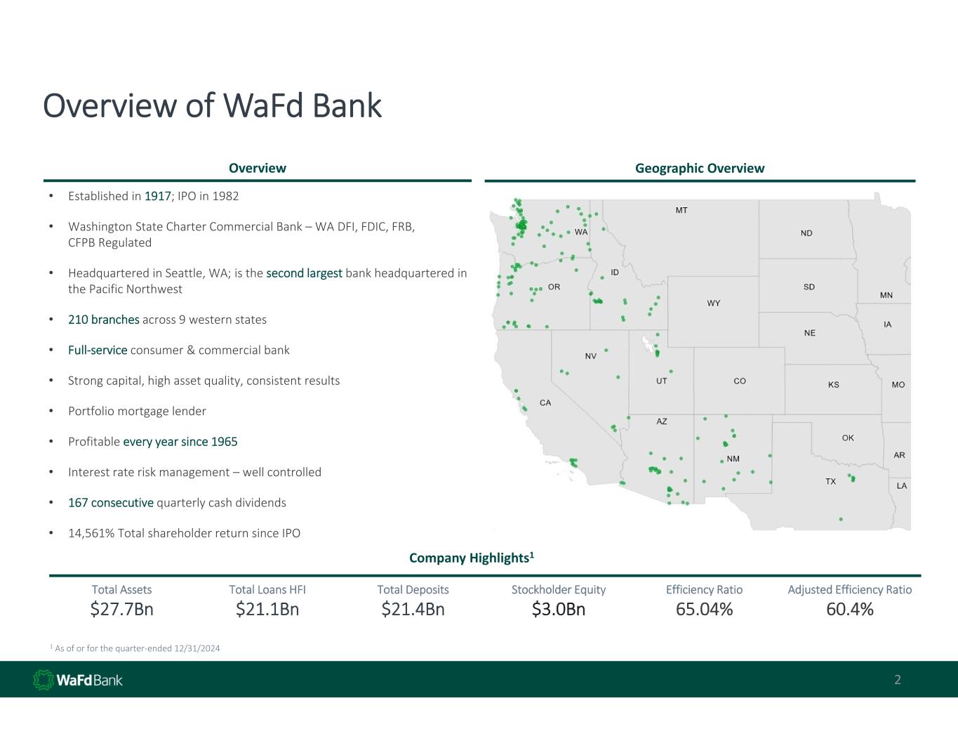 Overview of WaFd Bank 2 • Established in 1917; IPO in 1982 • Washington State Charter Commercial Bank – WA DFI, FDIC, FRB,  CFPB Regulated • Headquartered in Seattle, WA; is the second largest bank headquartered in  the Pacific Northwest • 210 branches across 9 western states • Full‐service consumer & commercial bank • Strong capital, high asset quality, consistent results • Portfolio mortgage lender • Profitable every year since 1965 • Interest rate risk management – well controlled • 167 consecutive quarterly cash dividends • 14,561% Total shareholder return since IPO  Adjusted Efficiency Ratio 60.4% Efficiency Ratio 65.04% Stockholder Equity $3.0Bn Total Deposits $21.4Bn Total Loans HFI $21.1Bn Total Assets $27.7Bn 1 As of or for the quarter‐ended 12/31/2024 Overview Geographic Overview Company Highlights1 2