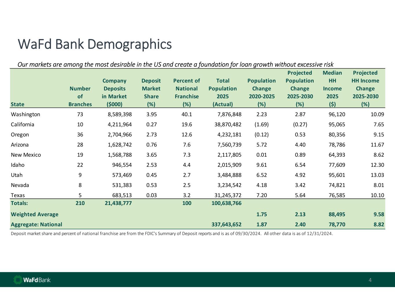 4 WaFd Bank Demographics Our markets are among the most desirable in the US and create a foundation for loan growth without excessive risk State Number of Branches Company Deposits in Market ($000) Deposit Market Share (%) Percent of National Franchise (%) Total Population 2025 (Actual) Population Change 2020‐2025 (%) Projected Population Change 2025‐2030 (%) Median HH Income 2025 ($) Projected HH Income Change 2025‐2030 (%) Washington 73 8,589,398 3.95 40.1 7,876,848 2.23 2.87 96,120 10.09 California 10 4,211,964 0.27 19.6 38,870,482 (1.69) (0.27) 95,065 7.65 Oregon 36 2,704,966 2.73 12.6 4,232,181 (0.12) 0.53 80,356 9.15 Arizona 28 1,628,742 0.76 7.6 7,560,739 5.72 4.40 78,786 11.67 New Mexico 19 1,568,788 3.65 7.3 2,117,805 0.01 0.89 64,393 8.62 Idaho 22 946,554 2.53 4.4 2,015,909 9.61 6.54 77,609 12.30 Utah 9 573,469 0.45 2.7 3,484,888 6.52 4.92 95,601 13.03 Nevada 8 531,383 0.53 2.5 3,234,542 4.18 3.42 74,821 8.01 Texas 5 683,513 0.03 3.2 31,245,372 7.20 5.64 76,585 10.10 Totals: 210 21,438,777 100 100,638,766 Weighted Average 1.75 2.13 88,495 9.58 Aggregate: National 337,643,652 1.87 2.40 78,770 8.82 Deposit market share and percent of national franchise are from the FDIC's Summary of Deposit reports and is as of 09/30/2024.  All other data is as of 12/31/2024.