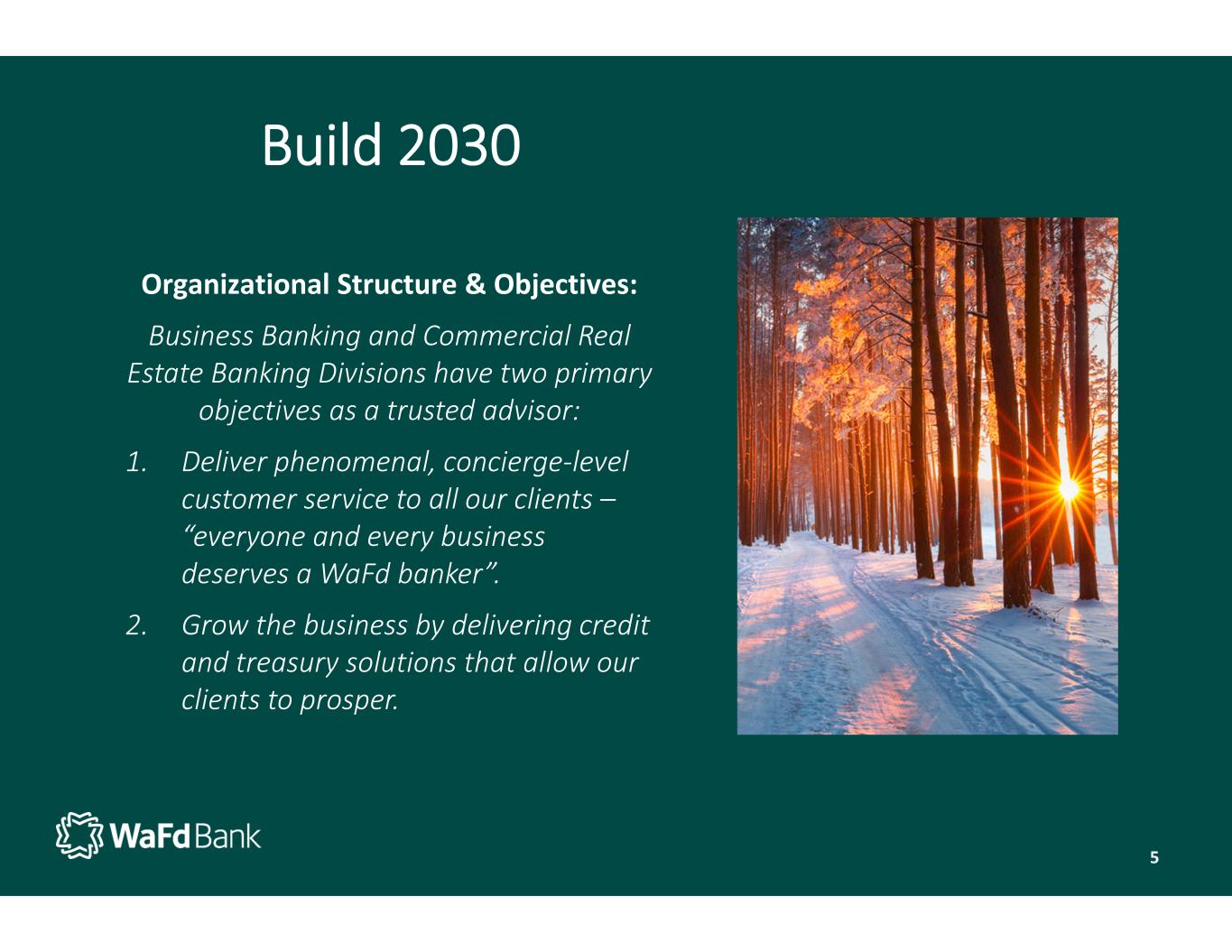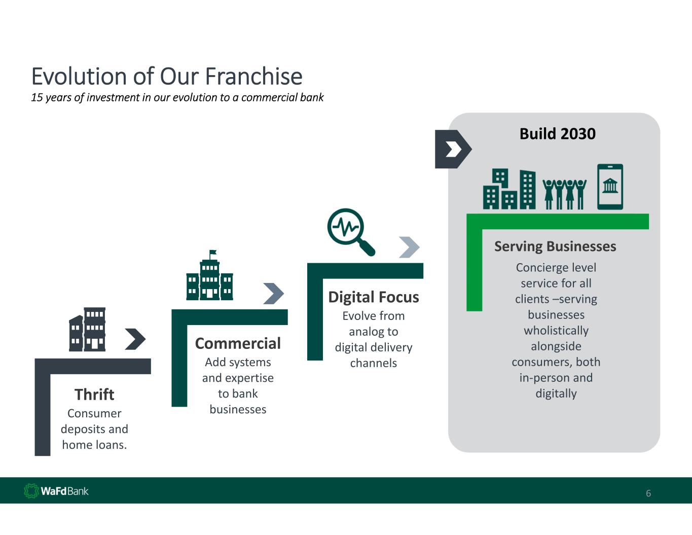 Organizational Structure & Objectives: Business Banking and Commercial Real  Estate Banking Divisions have two primary  objectives as a trusted advisor: 1. Deliver phenomenal, concierge‐level  customer service to all our clients – “everyone and every business  deserves a WaFd banker”. 2. Grow the business by delivering credit  and treasury solutions that allow our  clients to prosper. Build 2030 5
