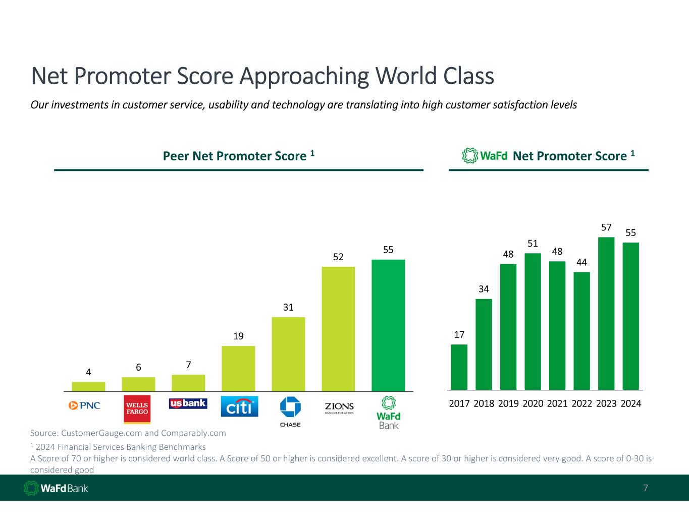 4 6 7 19 31 52 55 Net Promoter Score Approaching World Class 7 Our investments in customer service, usability and technology are translating into high customer satisfaction levels Source: CustomerGauge.com and Comparably.com WaFdaa Net Promoter Score 1 17 34 48 51 48 44 57 55 2017 2018 2019 2020 2021 2022 2023 2024 Peer Net Promoter Score 1 1 2024 Financial Services Banking Benchmarks A Score of 70 or higher is considered world class. A Score of 50 or higher is considered excellent. A score of 30 or higher is considered very good. A score of 0‐30 is  considered good 7