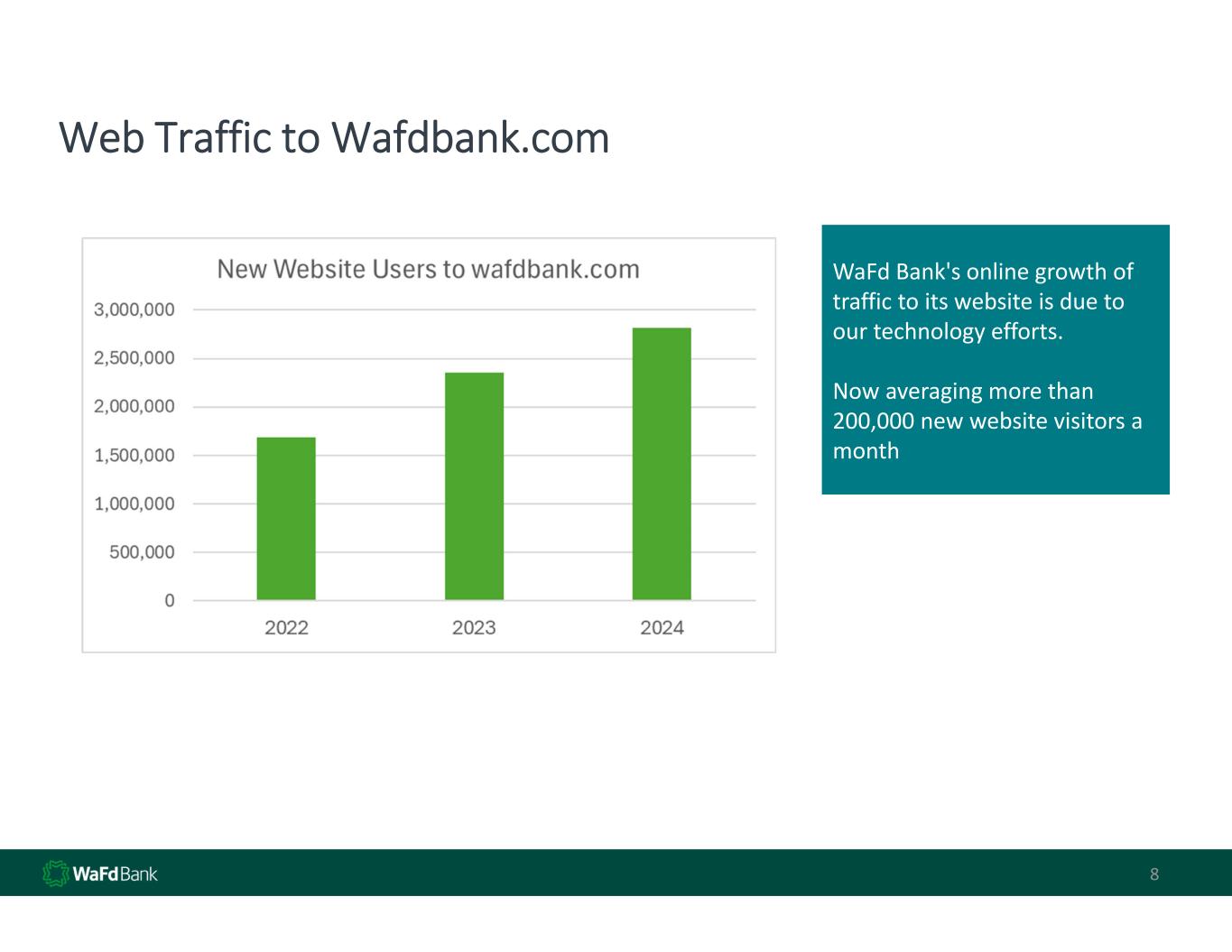 Web Traffic to Wafdbank.com 8 WaFd Bank's online growth of  traffic to its website is due to  our technology efforts. Now averaging more than  200,000 new website visitors a  month
