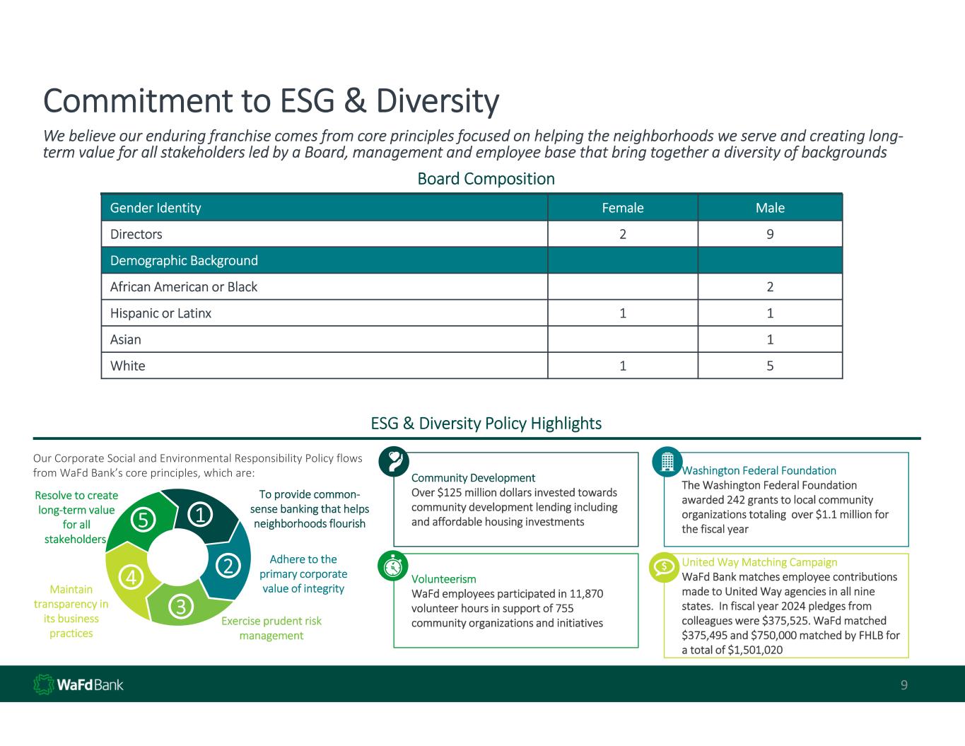 9 Commitment to ESG & Diversity We believe our enduring franchise comes from core principles focused on helping the neighborhoods we serve and creating long‐ term value for all stakeholders led by a Board, management and employee base that bring together a diversity of backgrounds Board Composition ESG & Diversity Policy Highlights Our Corporate Social and Environmental Responsibility Policy flows  from WaFd Bank’s core principles, which are: To provide common‐ sense banking that helps  neighborhoods flourish  Adhere to the  primary corporate  value of integrity Exercise prudent risk  management Maintain  transparency in  its business  practices Resolve to create  long‐term value  for all  stakeholders 1 2 3 4 5 Community Development Over $125 million dollars invested towards  community development lending including  and affordable housing investments Washington Federal Foundation The Washington Federal Foundation  awarded 242 grants to local community  organizations totaling  over $1.1 million for  the fiscal year Volunteerism WaFd employees participated in 11,870  volunteer hours in support of 755  community organizations and initiatives United Way Matching Campaign WaFd Bank matches employee contributions  made to United Way agencies in all nine  states.  In fiscal year 2024 pledges from  colleagues were $375,525. WaFdmatched  $375,495 and $750,000 matched by FHLB for  a total of $1,501,020 MaleFemaleGender Identity 92Directors Demographic Background 2African American or Black 11Hispanic or Latinx 1Asian 51White
