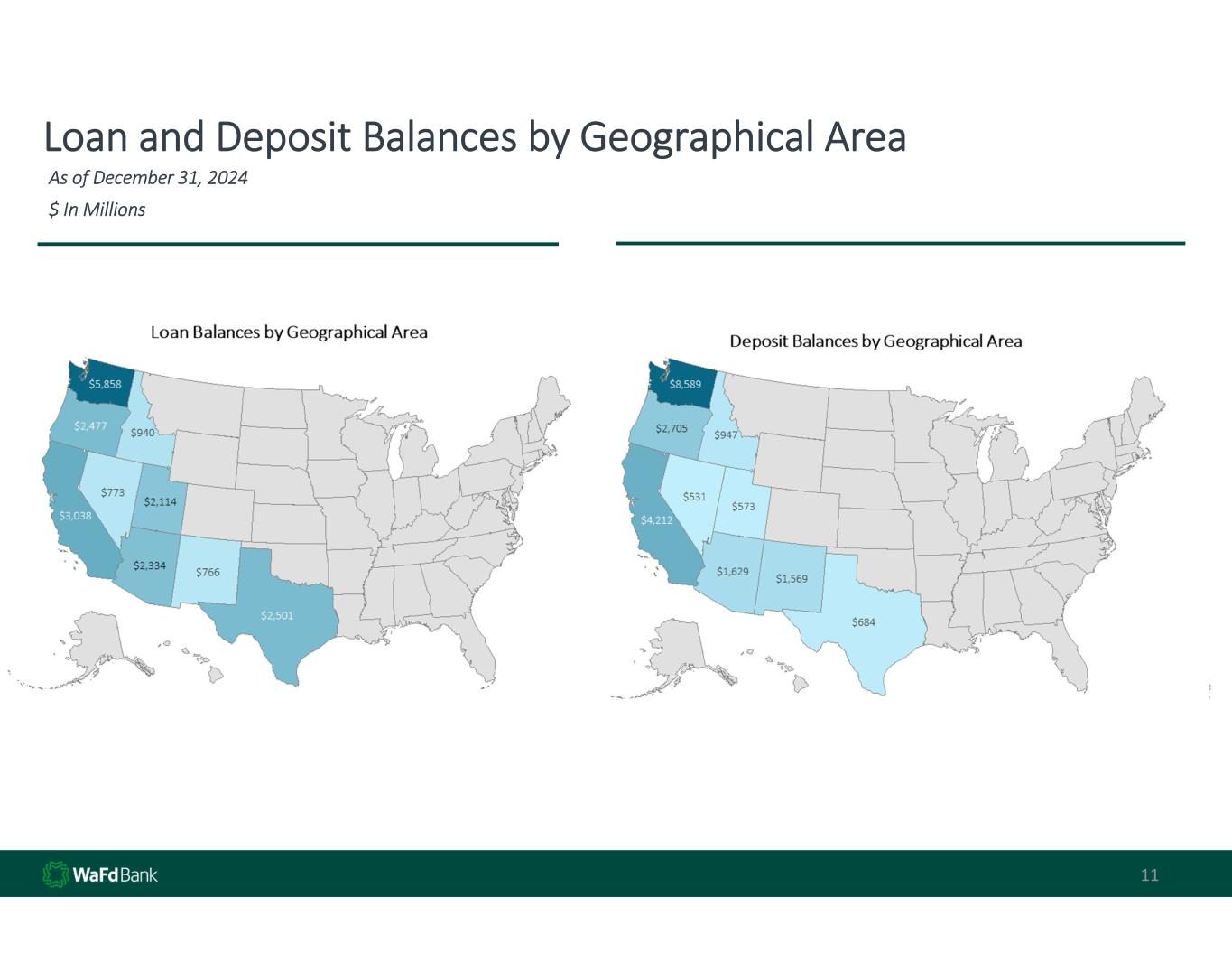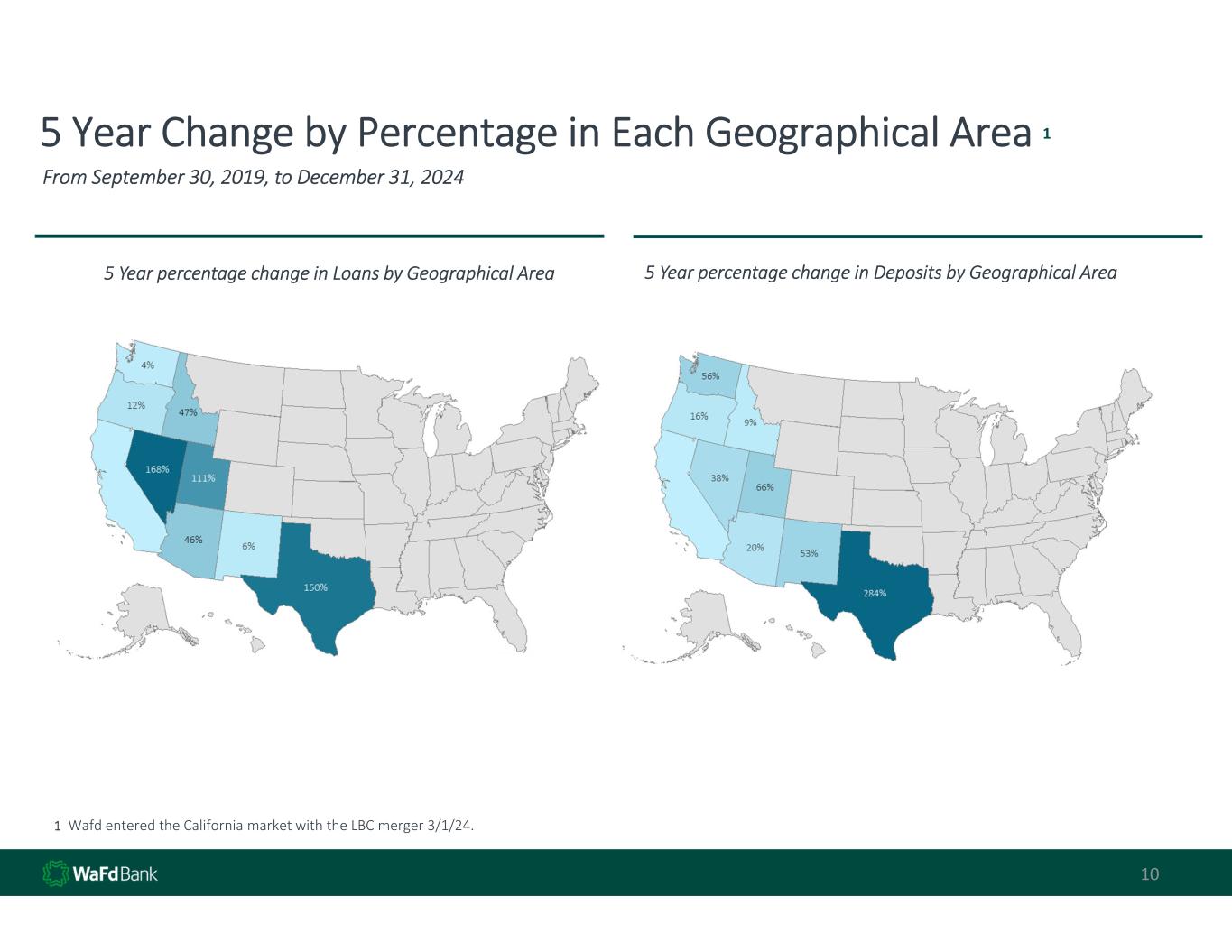 10 5 Year Change by Percentage in Each Geographical Area 1 From September 30, 2019, to December 31, 2024 1 Wafd entered the California market with the LBC merger 3/1/24. 5 Year percentage change in Loans by Geographical Area 5 Year percentage change in Deposits by Geographical Area