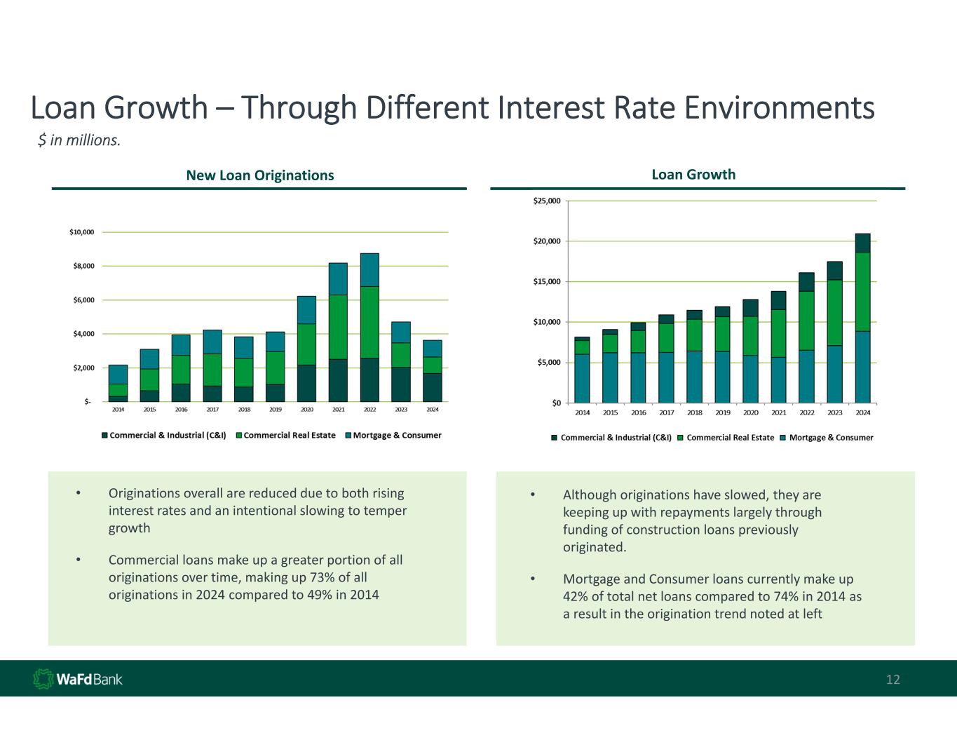 12 Loan Growth – Through Different Interest Rate Environments • Although originations have slowed, they are  keeping up with repayments largely through  funding of construction loans previously  originated. • Mortgage and Consumer loans currently make up  42% of total net loans compared to 74% in 2014 as  a result in the origination trend noted at left Loan GrowthNew Loan Originations $ in millions. • Originations overall are reduced due to both rising  interest rates and an intentional slowing to temper  growth • Commercial loans make up a greater portion of all  originations over time, making up 73% of all  originations in 2024 compared to 49% in 2014
