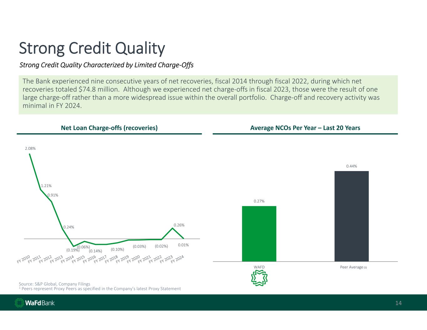 0.27%  0.44%  WAFD Peer Average Strong Credit Quality 14 2.08% 1.21% 0.91% 0.24% (0.19%) (0.06%) (0.14%) (0.10%) (0.03%) (0.02%) 0.26% 0.01% Net Loan Charge‐offs (recoveries) Average NCOs Per Year – Last 20 Years Source: S&P Global, Company Filings 1 Peers represent Proxy Peers as specified in the Company’s latest Proxy Statement (1) Strong Credit Quality Characterized by Limited Charge‐Offs The Bank experienced nine consecutive years of net recoveries, fiscal 2014 through fiscal 2022, during which net  recoveries totaled $74.8 million.  Although we experienced net charge‐offs in fiscal 2023, those were the result of one  large charge‐off rather than a more widespread issue within the overall portfolio.  Charge‐off and recovery activity was   minimal in FY 2024.