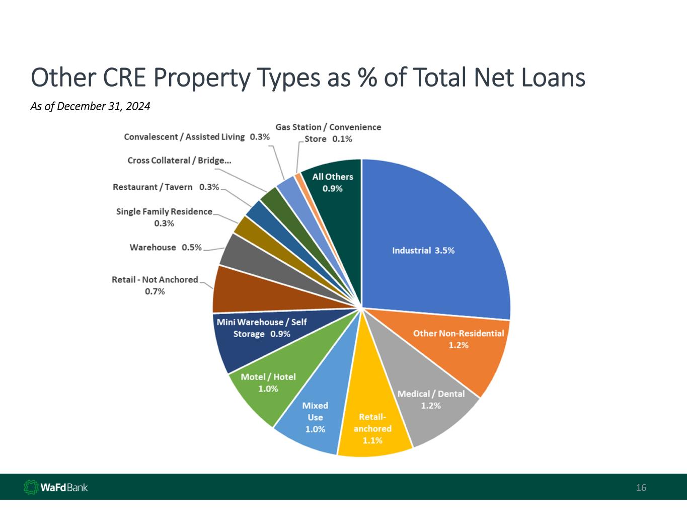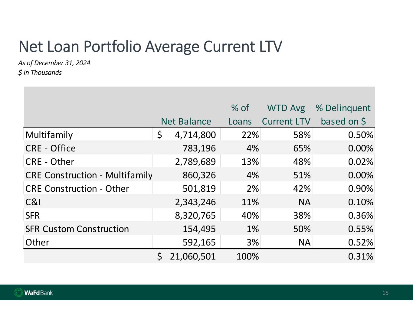 Net Loan Portfolio Average Current LTV 15 As of December 31, 2024 $ In Thousands Net Balance % of  Loans WTD Avg  Current LTV % Delinquent  based on $ Multifamily 4,714,800$       22% 58% 0.50% CRE ‐ Office 783,196            4% 65% 0.00% CRE ‐ Other 2,789,689         13% 48% 0.02% CRE Construction ‐ Multifamily 860,326            4% 51% 0.00% CRE Construction ‐ Other 501,819            2% 42% 0.90% C&I 2,343,246         11% NA 0.10% SFR 8,320,765         40% 38% 0.36% SFR Custom Construction 154,495            1% 50% 0.55% Other 592,165            3% NA 0.52% 21,060,501$     100% 0.31%
