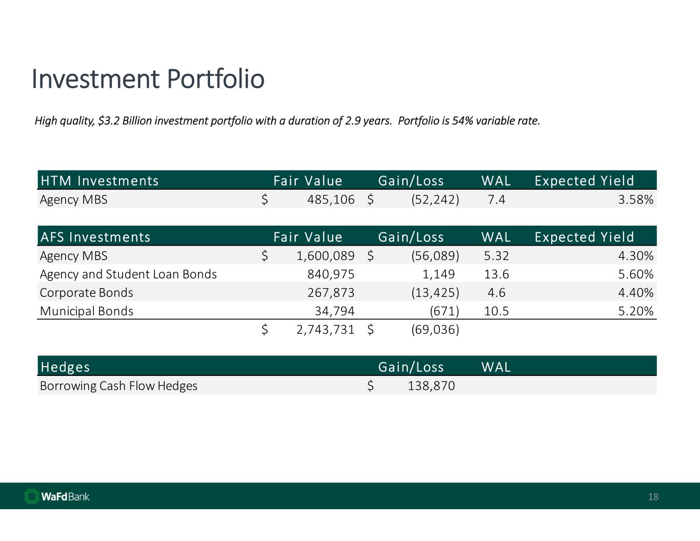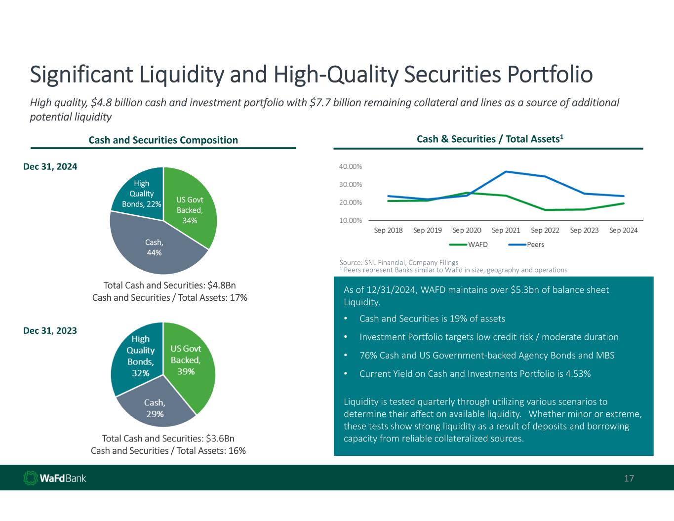 Significant Liquidity and High‐Quality Securities Portfolio 17 High quality, $4.8 billion cash and investment portfolio with $7.7 billion remaining collateral and lines as a source of additional  potential liquidity  Cash and Securities Composition  Total Cash and Securities: $4.8Bn  Cash and Securities / Total Assets: 17%  Cash & Securities / Total Assets1 US Govt  Backed,  34% Cash,  44% High  Quality  Bonds, 22% As of 12/31/2024, WAFD maintains over $5.3bn of balance sheet  Liquidity. • Cash and Securities is 19% of assets • Investment Portfolio targets low credit risk / moderate duration • 76% Cash and US Government‐backed Agency Bonds and MBS • Current Yield on Cash and Investments Portfolio is 4.53%  Liquidity is tested quarterly through utilizing various scenarios to  determine their affect on available liquidity.   Whether minor or extreme,  these tests show strong liquidity as a result of deposits and borrowing  capacity from reliable collateralized sources. Source: SNL Financial, Company Filings 1 Peers represent Banks similar to WaFd in size, geography and operations Total Cash and Securities: $3.6Bn  Cash and Securities / Total Assets: 16%  Dec 31, 2023 Dec 31, 2024