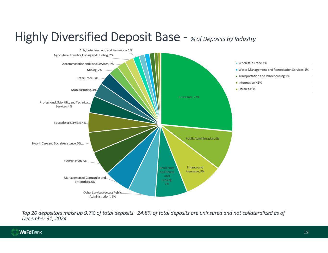 Highly Diversified Deposit Base ‐ % of Deposits by Industry 19 Top 20 depositors make up 9.7% of total deposits.  24.8% of total deposits are uninsured and not collateralized as of  December 31, 2024.