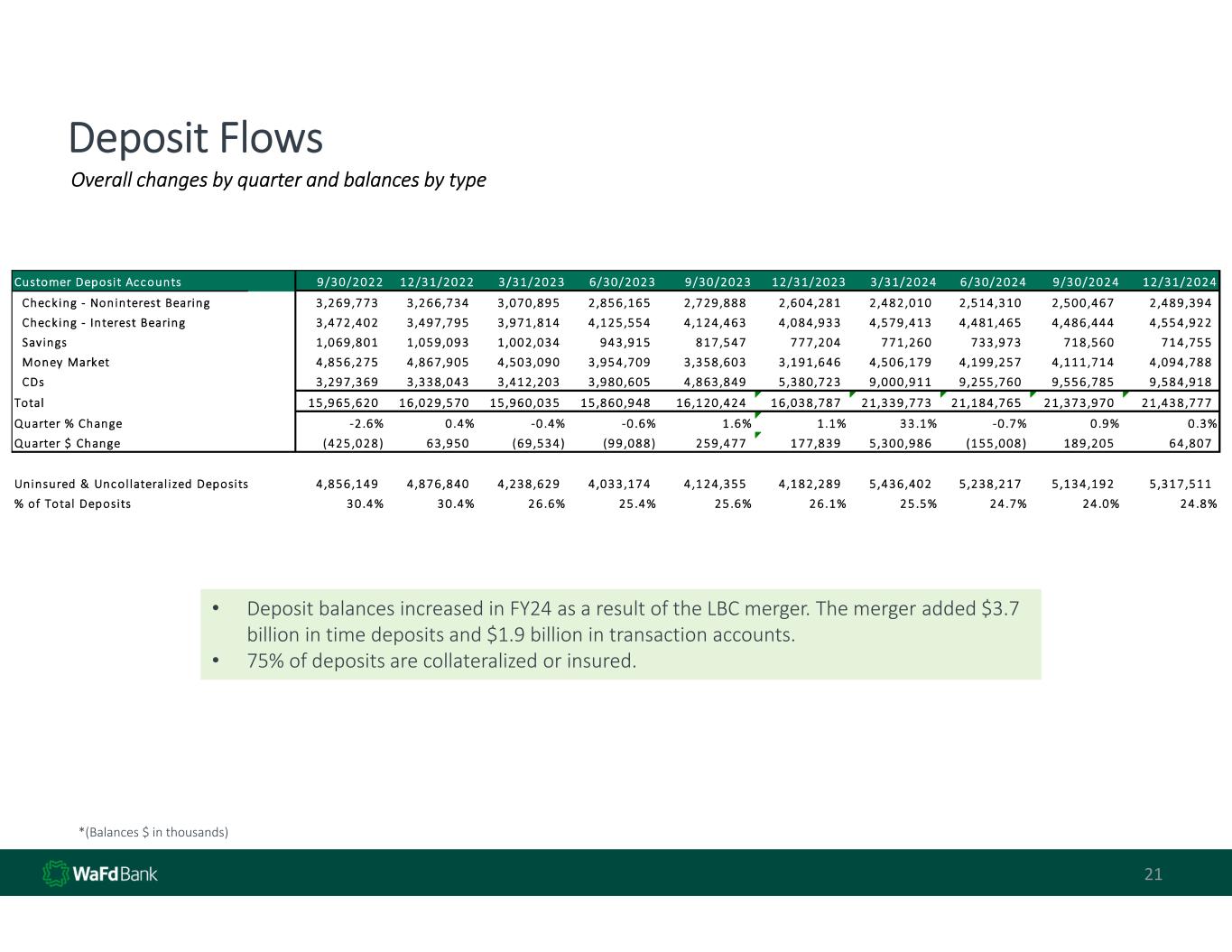 21 Deposit Flows *(Balances $ in thousands) • Deposit balances increased in FY24 as a result of the LBC merger. The merger added $3.7  billion in time deposits and $1.9 billion in transaction accounts. • 75% of deposits are collateralized or insured. Overall changes by quarter and balances by type Customer Deposit Accounts 9/30/2022 12/31/2022 3/31/2023 6/30/2023 9/30/2023 12/31/2023 3/31/2024 6/30/2024 9/30/2024 12/31/2024    Checking  ‐  Noninterest Bearing 3 ,269 ,773        3,266,734        3,070,895        2,856 ,165        2,729 ,888          2,604,281          2,482,010        2,514 ,310        2,500,467        2,489 ,394               Checking  ‐   Interest Bearing 3 ,472 ,402        3,497,795        3,971,814        4,125 ,554        4,124 ,463          4,084,933          4,579,413        4,481 ,465        4,486,444        4,554 ,922               Savings 1 ,069 ,801        1,059,093        1,002,034        943,915              817,547                777,204                771,260              733,973              718,560              714,755                     Money  Market 4 ,856 ,275        4,867,905        4,503,090        3,954 ,709        3,358 ,603          3,191,646          4,506,179        4,199 ,257        4,111,714        4,094 ,788               CDs 3 ,297 ,369        3,338,043        3,412,203        3,980 ,605        4,863 ,849          5,380,723          9,000,911        9,255 ,760        9,556,785        9,584 ,918            Total 15 ,965 ,620    16,029,570    15,960,035    15,860 ,948    16,120 ,424      16,038,787      21,339,773    21,184 ,765    21,373,970    21,438 ,777        Quarter % Change ‐2.6% 0.4% ‐0.4% ‐0.6% 1.6% 1.1% 33.1% ‐0.7% 0.9% 0.3% Quarter $  Change (425 ,028)            63,950                  (69,534)                (99 ,088)                259,477                177,839                5,300,986        (155 ,008)          189,205              64,807                      Uninsured  &  Uncollateral ized  Deposits 4 ,856 ,149        4,876,840        4,238,629        4,033 ,174        4,124 ,355          4,182,289          5,436,402        5,238 ,217        5,134,192        5,317 ,511            % of  Total  Deposits 30.4% 30.4% 26.6% 25.4% 25.6% 26.1% 25.5% 24.7% 24.0% 24.8%
