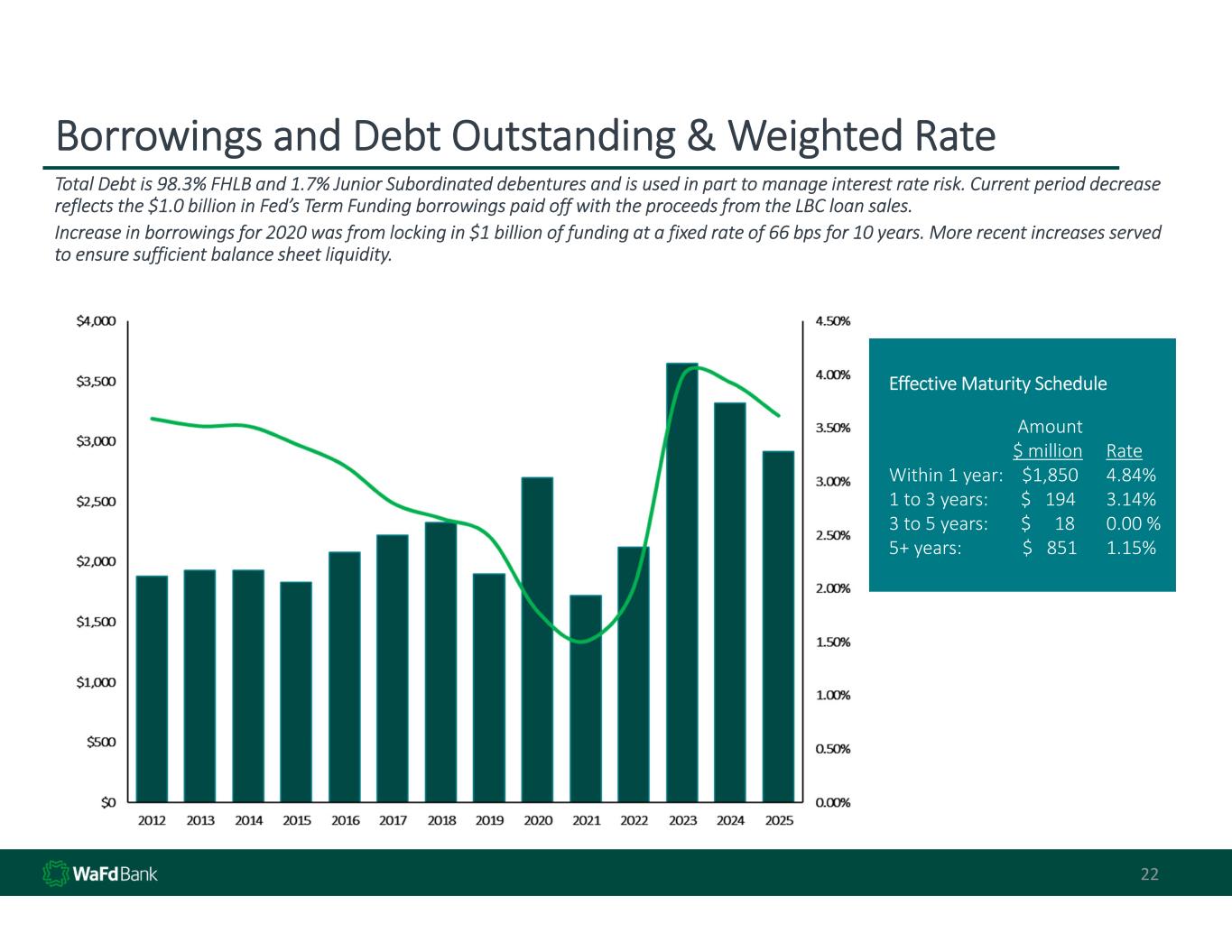 Borrowings and Debt Outstanding & Weighted Rate 22 Total Debt is 98.3% FHLB and 1.7% Junior Subordinated debentures and is used in part to manage interest rate risk. Current period decrease  reflects the $1.0 billion in Fed’s Term Funding borrowings paid off with the proceeds from the LBC loan sales. Increase in borrowings for 2020 was from locking in $1 billion of funding at a fixed rate of 66 bps for 10 years. More recent increases served  to ensure sufficient balance sheet liquidity. Effective Maturity Schedule Amount $ million Rate Within 1 year:    $1,850 4.84% 1 to 3 years:       $   194 3.14% 3 to 5 years:       $     18 0.00 % 5+ years:             $   851 1.15%