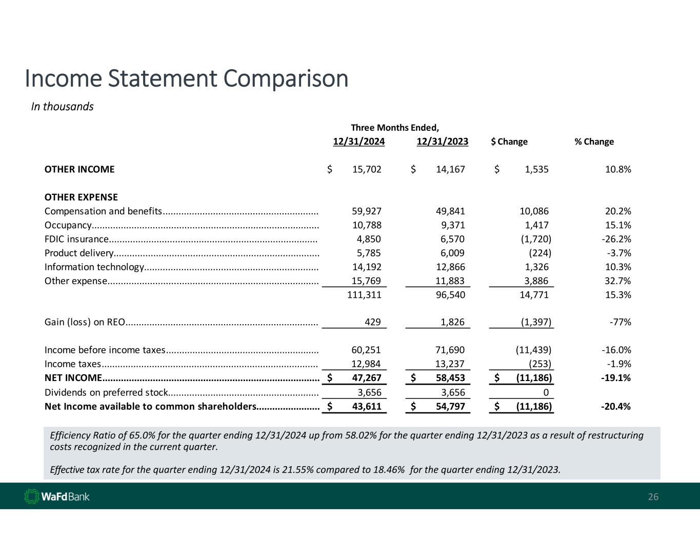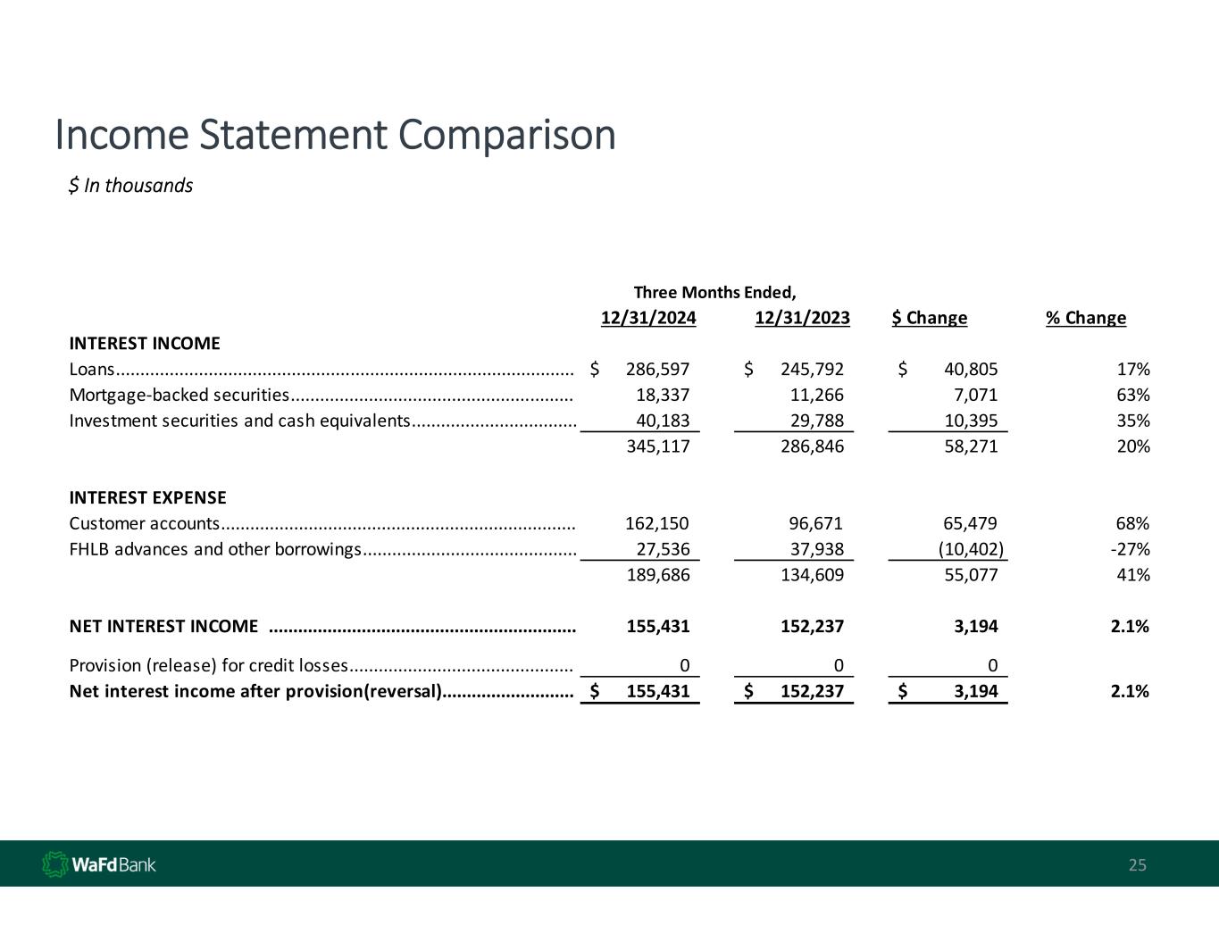 25 Income Statement Comparison 25 $ In thousands 12/31/2024 12/31/2023 $ Change % Change INTEREST INCOME Loans.............................................................................................. 286,597$       245,792$       40,805$         17% Mortgage‐backed securities.......................................................... 18,337 11,266 7,071 63% Investment securities and cash equivalents.................................. 40,183 29,788 10,395 35% 345,117 286,846 58,271 20% INTEREST EXPENSE Customer accounts......................................................................... 162,150 96,671 65,479 68% FHLB advances and other borrowings............................................ 27,536 37,938 (10,402) ‐27%                                                                                                           189,686 134,609 55,077 41% NET INTEREST INCOME  ............................................................... 155,431         152,237         3,194             2.1% Provision (release) for credit losses.............................................. 0 0 0 Net interest income after provision(reversal)........................... 155,431$       152,237$       3,194$           2.1% Three Months Ended,