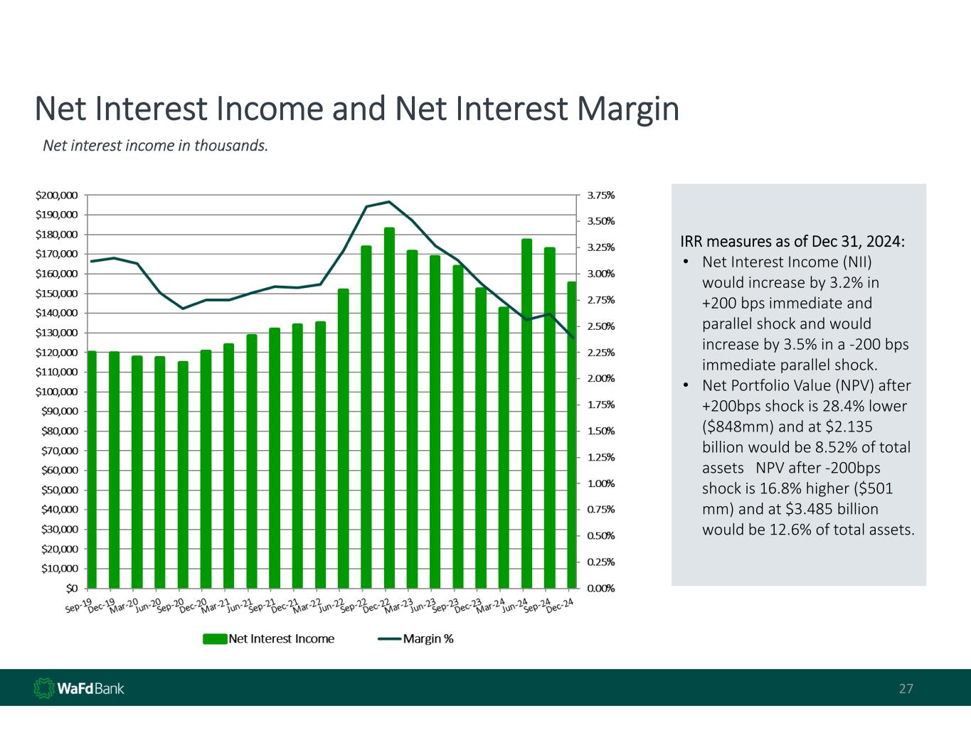 27 Net Interest Income and Net Interest Margin Net interest income in thousands.  IRR measures as of Dec 31, 2024: • Net Interest Income (NII)  would increase by 3.2% in  +200 bps immediate and  parallel shock and would  increase by 3.5% in a ‐200 bps  immediate parallel shock. • Net Portfolio Value (NPV) after  +200bps shock is 28.4% lower  ($848mm) and at $2.135  billion would be 8.52% of total  assets   NPV after ‐200bps  shock is 16.8% higher ($501  mm) and at $3.485 billion  would be 12.6% of total assets.