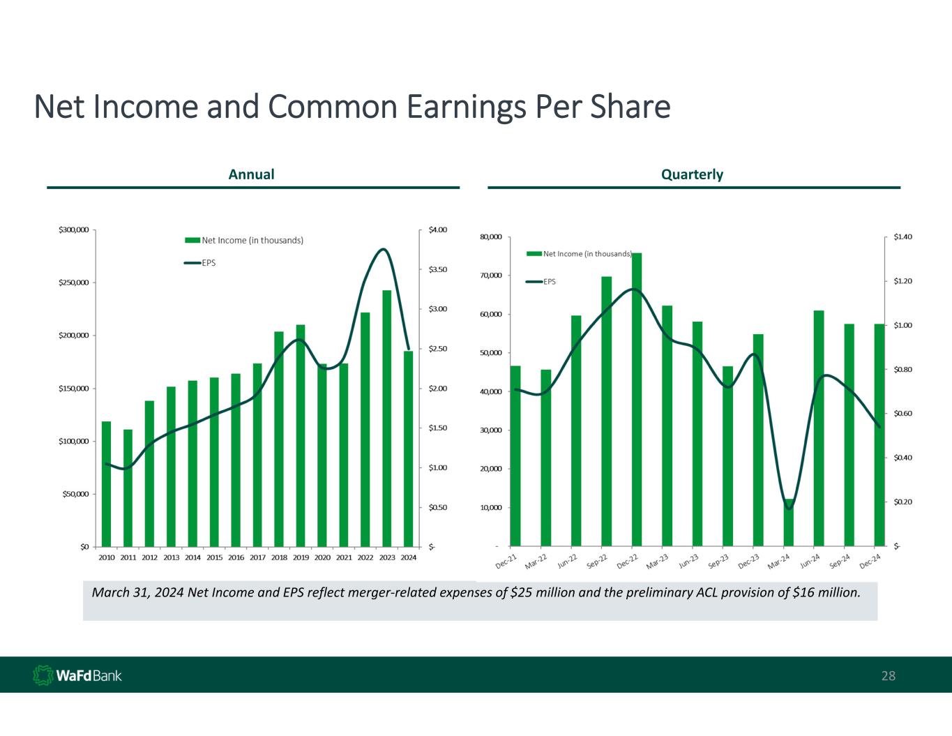 28 Net Income and Common Earnings Per Share Annual Quarterly March 31, 2024 Net Income and EPS reflect merger‐related expenses of $25 million and the preliminary ACL provision of $16 million.