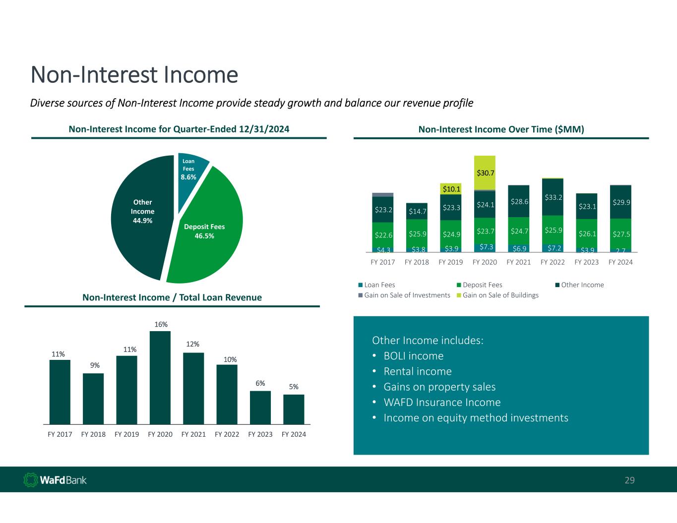 Non‐Interest Income 29 Diverse sources of Non‐Interest Income provide steady growth and balance our revenue profile Non‐Interest Income for Quarter‐Ended 12/31/2024 Non‐Interest Income Over Time ($MM) Non‐Interest Income / Total Loan Revenue Other Income includes: • BOLI income • Rental income • Gains on property sales • WAFD Insurance Income • Income on equity method investments Loan Fees 8.6% Deposit Fees 46.5% Other Income 44.9% 11% 9% 11% 16% 12% 10% 6% 5% FY 2017 FY 2018 FY 2019 FY 2020 FY 2021 FY 2022 FY 2023 FY 2024 $4.3  $3.8  $3.9  $7.3  $6.9  $7.2  $3.9  2.7 $22.6  $25.9  $24.9  $23.7  $24.7  $25.9  $26.1  $27.5  $23.2  $14.7  $23.3  $24.1  $28.6  $33.2  $23.1  $29.9  $10.1  $30.7  FY 2017 FY 2018 FY 2019 FY 2020 FY 2021 FY 2022 FY 2023 FY 2024 Loan Fees Deposit Fees Other Income Gain on Sale of Investments Gain on Sale of Buildings