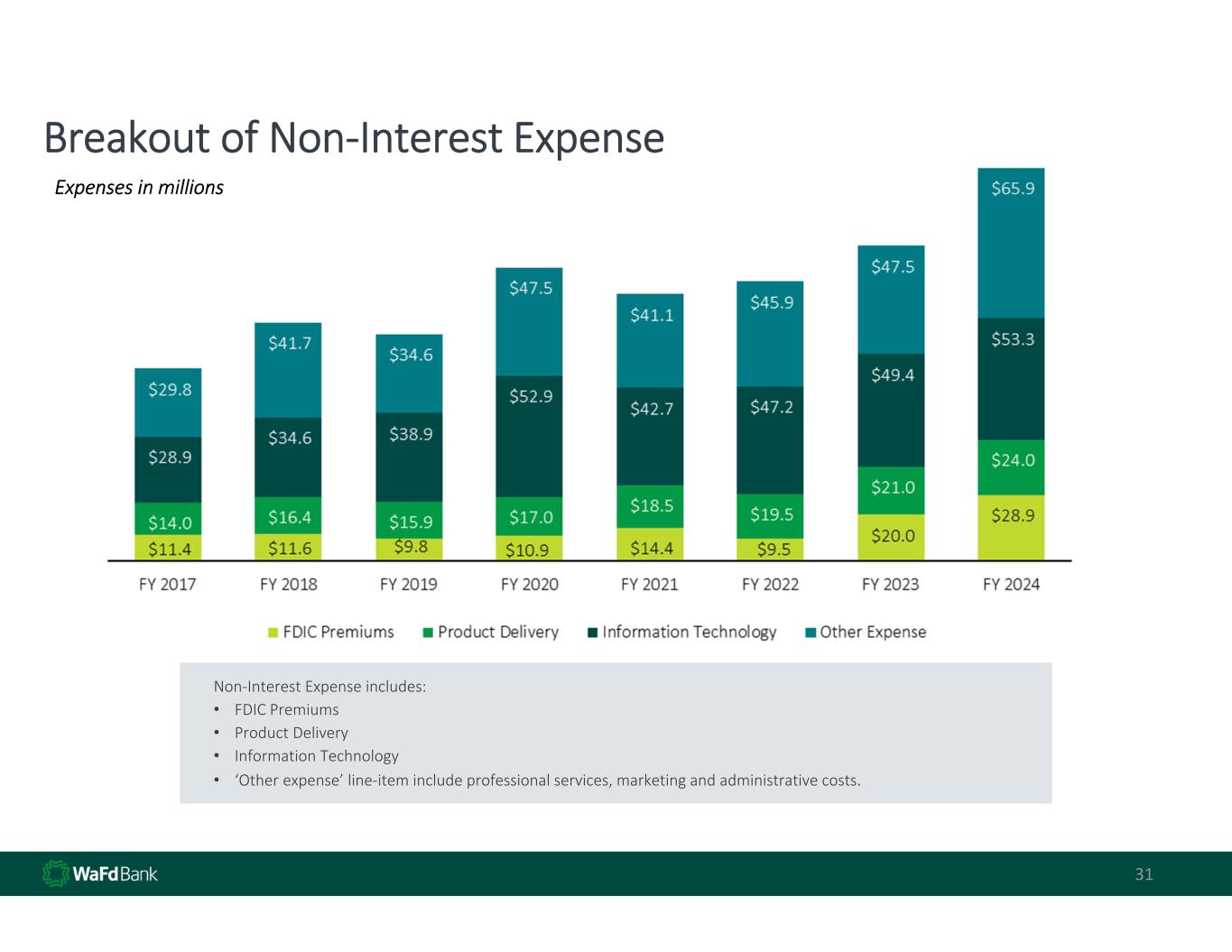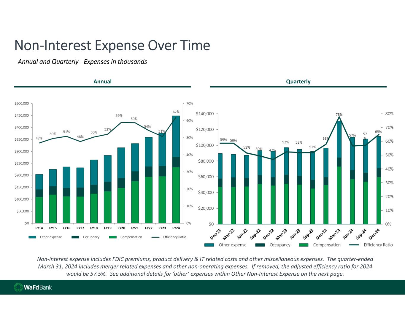 30 Non‐Interest Expense Over Time Annual and Quarterly ‐ Expenses in thousands Annual  Quarterly Non‐interest expense includes FDIC premiums, product delivery & IT related costs and other miscellaneous expenses.  The quarter‐ended  March 31, 2024 includes merger related expenses and other non‐operating expenses.  If removed, the adjusted efficiency ratio for 2024  would be 57.5%.  See additional details for ‘other’ expenses within Other Non‐Interest Expense on the next page.