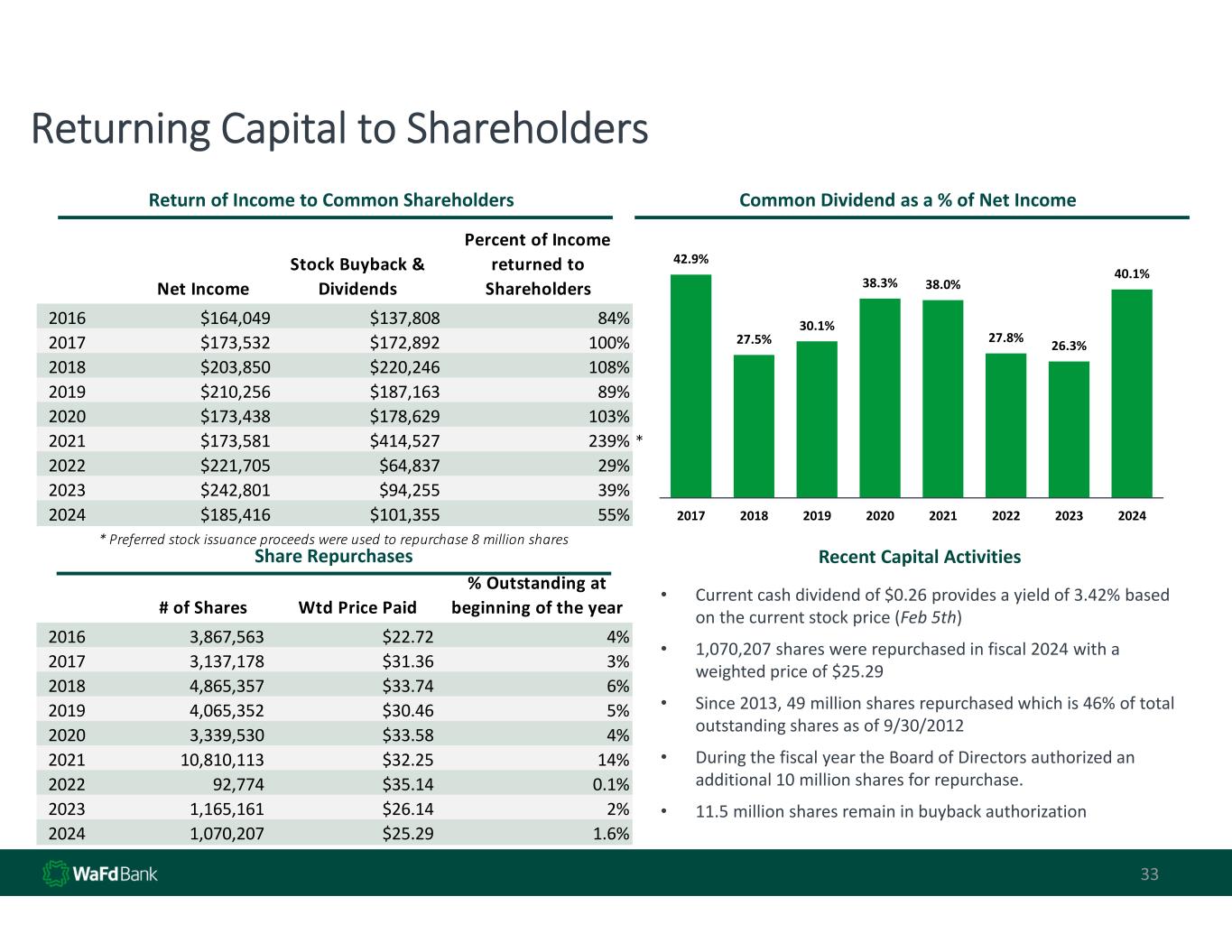 Net Income Stock Buyback &  Dividends Percent of Income  returned to  Shareholders 2016 $164,049 $137,808 84% 2017 $173,532 $172,892 100% 2018 $203,850 $220,246 108% 2019 $210,256 $187,163 89% 2020 $173,438 $178,629 103% 2021 $173,581 $414,527 239% * 2022 $221,705 $64,837 29% 2023 $242,801 $94,255 39% 2024 $185,416 $101,355 55% * Preferred stock issuance proceeds were used to repurchase 8 million shares Returning Capital to Shareholders Recent Capital Activities • Current cash dividend of $0.26 provides a yield of 3.42% based  on the current stock price (Feb 5th) • 1,070,207 shares were repurchased in fiscal 2024 with a  weighted price of $25.29 • Since 2013, 49 million shares repurchased which is 46% of total  outstanding shares as of 9/30/2012 • During the fiscal year the Board of Directors authorized an  additional 10 million shares for repurchase.  • 11.5 million shares remain in buyback authorization 33 Common Dividend as a % of Net Income 42.9% 27.5% 30.1% 38.3% 38.0% 27.8% 26.3% 40.1% 2017 2018 2019 2020 2021 2022 2023 2024 Return of Income to Common Shareholders Share Repurchases # of Shares Wtd Price Paid % Outstanding at  beginning of the year 2016 3,867,563            $22.72 4% 2017 3,137,178            $31.36 3% 2018 4,865,357            $33.74 6% 2019 4,065,352            $30.46 5% 2020 3,339,530            $33.58 4% 2021 10,810,113          $32.25 14% 2022 92,774                 $35.14 0.1% 2023 1,165,161            $26.14 2% 2024 1,070,207            $25.29 1.6%