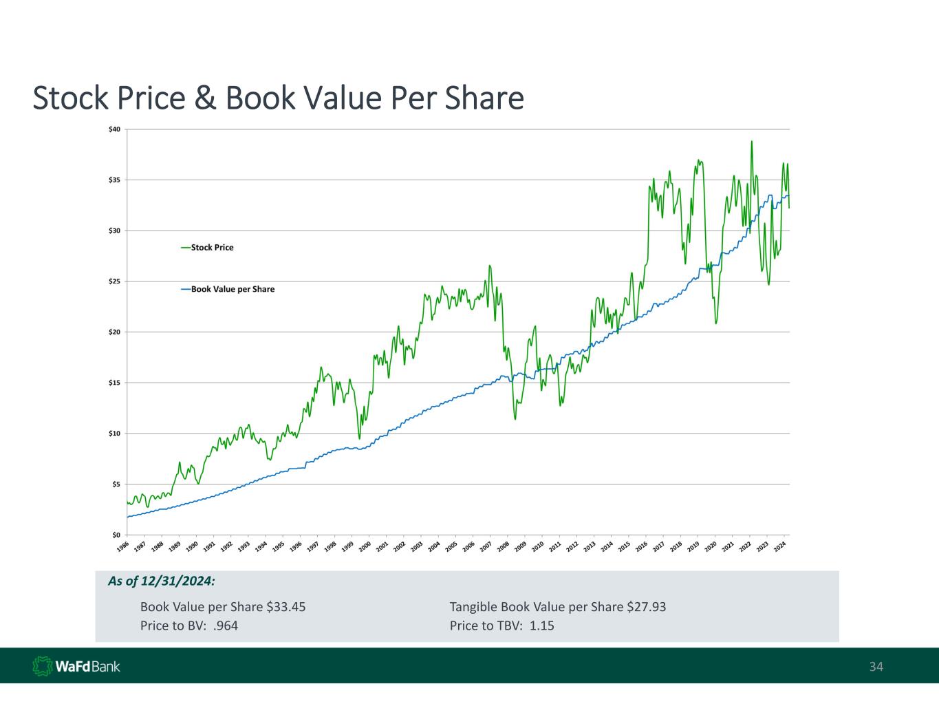 As of 12/31/2024: Book Value per Share $33.45 Tangible Book Value per Share $27.93 Price to BV:  .964 Price to TBV:  1.15 Stock Price & Book Value Per Share 34