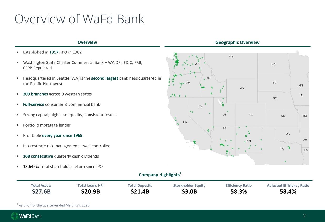 This presentation contains forward-looking statements within the meaning of the Private Securities Litigation Reform Act of 1995. Such statements are based upon the current beliefs and expectations of Washington Federal’s management and are subject to significant risks and uncertainties. The forward-looking statements in this presentation speak only as of the date of the presentation, and Washington Federal assumes no duty, and does not undertake, to update them. Actual results or future events could differ, possibly materially, from those that we anticipated in these forward-looking statements. 1 Investor Presentation As of March 31, 2025
