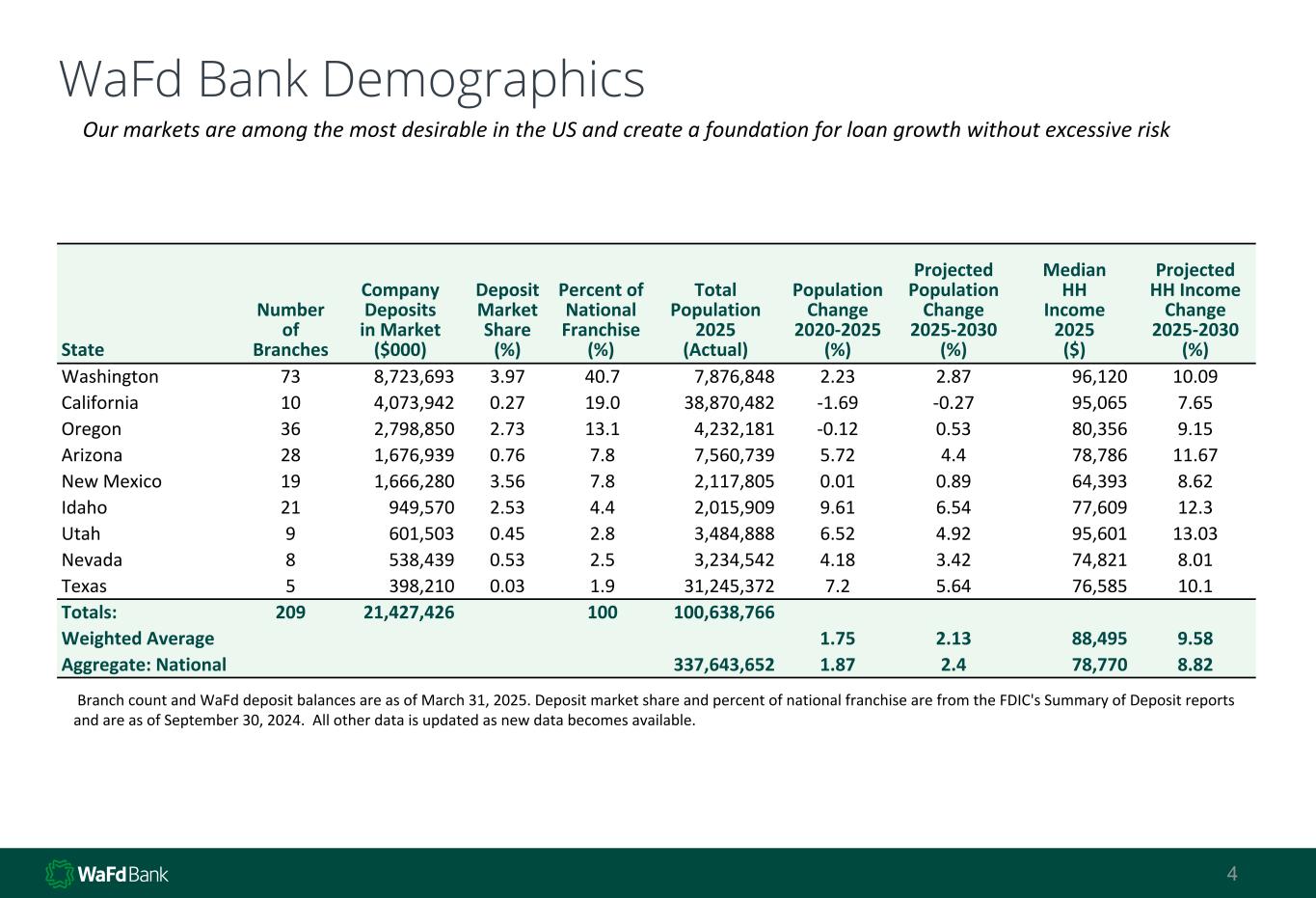 Overview of WaFd Bank 2 • Established in 1917; IPO in 1982 • Washington State Charter Commercial Bank – WA DFI, FDIC, FRB, CFPB Regulated • Headquartered in Seattle, WA; is the second largest bank headquartered in the Pacific Northwest • 209 branches across 9 western states • Full-service consumer & commercial bank • Strong capital, high asset quality, consistent results • Portfolio mortgage lender • Profitable every year since 1965 • Interest rate risk management – well controlled • 168 consecutive quarterly cash dividends • 13,646% Total shareholder return since IPO Total Assets $27.6B Total Loans HFI $20.9B Total Deposits $21.4B Stockholder Equity $3.0B Efficiency Ratio 58.3% Adjusted Efficiency Ratio 58.4% 1 As of or for the quarter-ended March 31, 2025 Overview Geographic Overview Company Highlights1 2