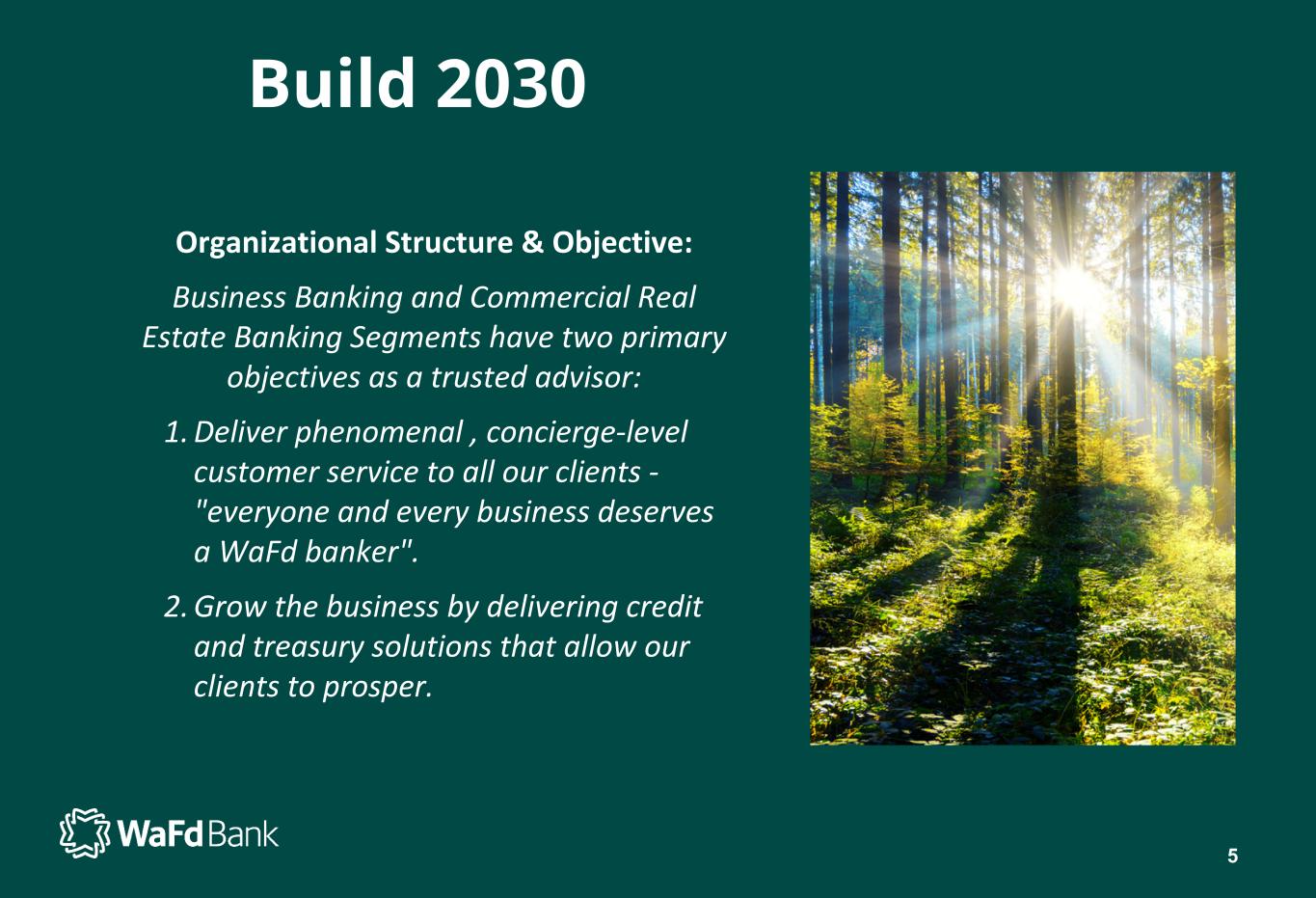 Organizational Structure & Objective: Business Banking and Commercial Real Estate Banking Segments have two primary objectives as a trusted advisor: 1.Deliver phenomenal , concierge-level customer service to all our clients - "everyone and every business deserves a WaFd banker". 2.Grow the business by delivering credit and treasury solutions that allow our clients to prosper. Build 2030 5