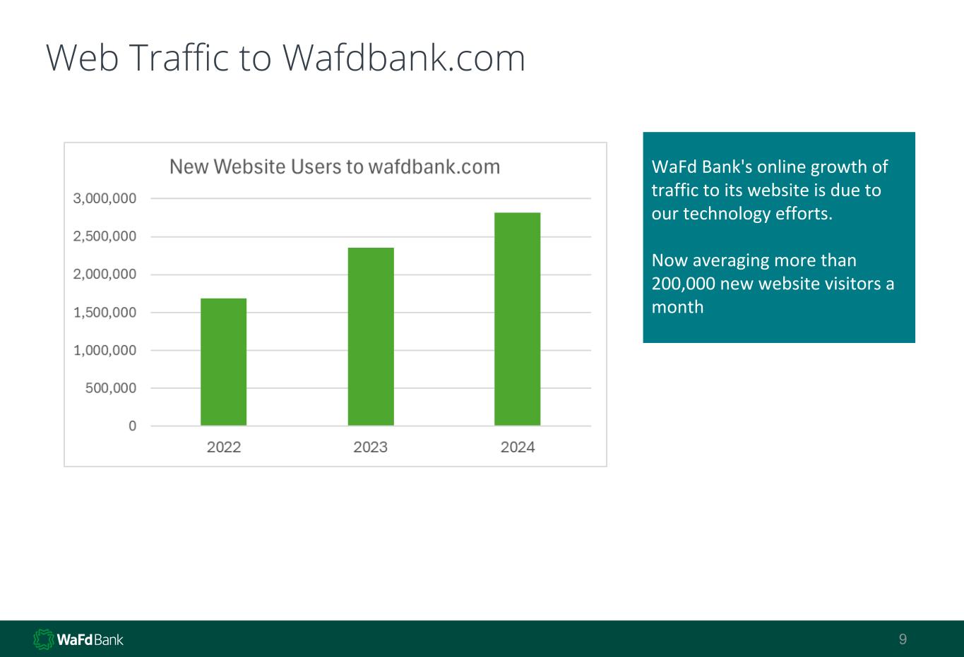 Web Traffic to Wafdbank.com 9 WaFd Bank's online growth of traffic to its website is due to our technology efforts. Now averaging more than 200,000 new website visitors a month