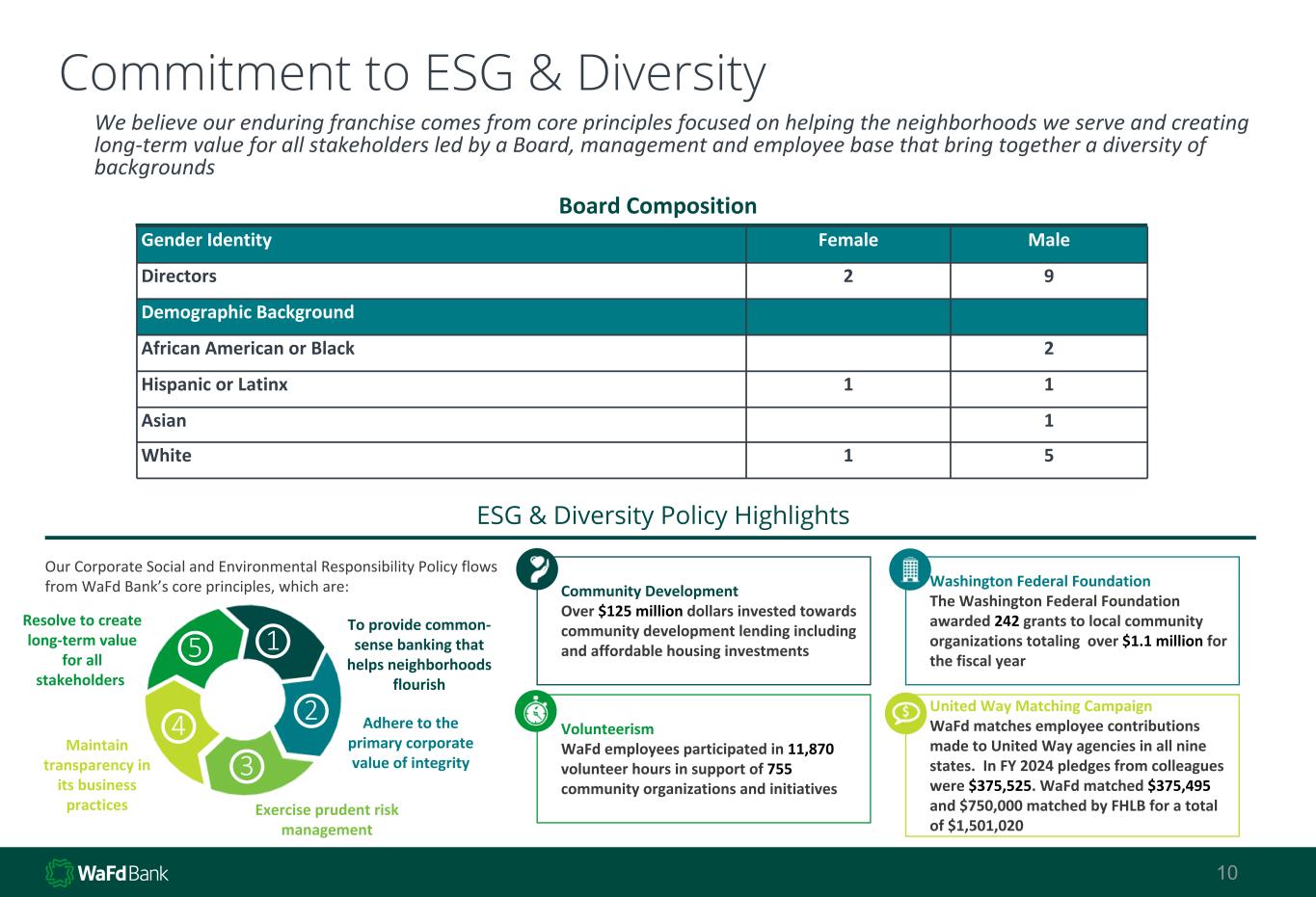10 Commitment to ESG & Diversity We believe our enduring franchise comes from core principles focused on helping the neighborhoods we serve and creating long-term value for all stakeholders led by a Board, management and employee base that bring together a diversity of backgrounds Board Composition ESG & Diversity Policy Highlights Our Corporate Social and Environmental Responsibility Policy flows from WaFd Bank’s core principles, which are: To provide common- sense banking that helps neighborhoods flourish Adhere to the primary corporate value of integrity Exercise prudent risk management Maintain transparency in its business practices Resolve to create long-term value for all stakeholders 1 2 3 4 5 Community Development Over $125 million dollars invested towards community development lending including and affordable housing investments Washington Federal Foundation The Washington Federal Foundation awarded 242 grants to local community organizations totaling over $1.1 million for the fiscal year Volunteerism WaFd employees participated in 11,870 volunteer hours in support of 755 community organizations and initiatives United Way Matching Campaign WaFd matches employee contributions made to United Way agencies in all nine states. In FY 2024 pledges from colleagues were $375,525. WaFd matched $375,495 and $750,000 matched by FHLB for a total of $1,501,020 Gender Identity Female Male Directors 2 9 Demographic Background African American or Black 2 Hispanic or Latinx 1 1 Asian 1 White 1 5
