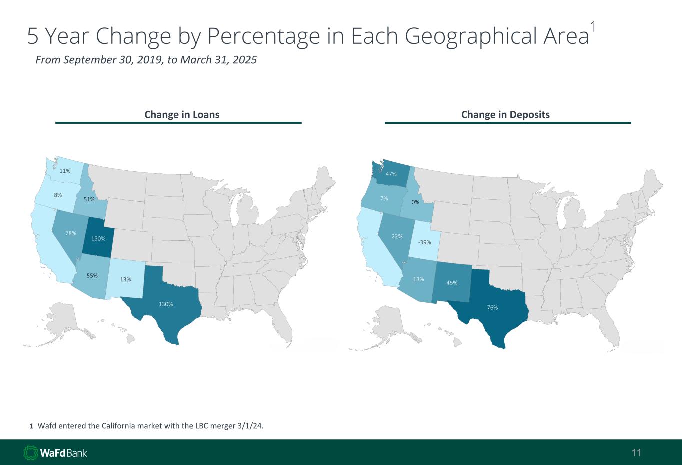 11 5 Year Change by Percentage in Each Geographical Area1 From September 30, 2019, to March 31, 2025 1 Wafd entered the California market with the LBC merger 3/1/24. Change in Loans Change in Deposits