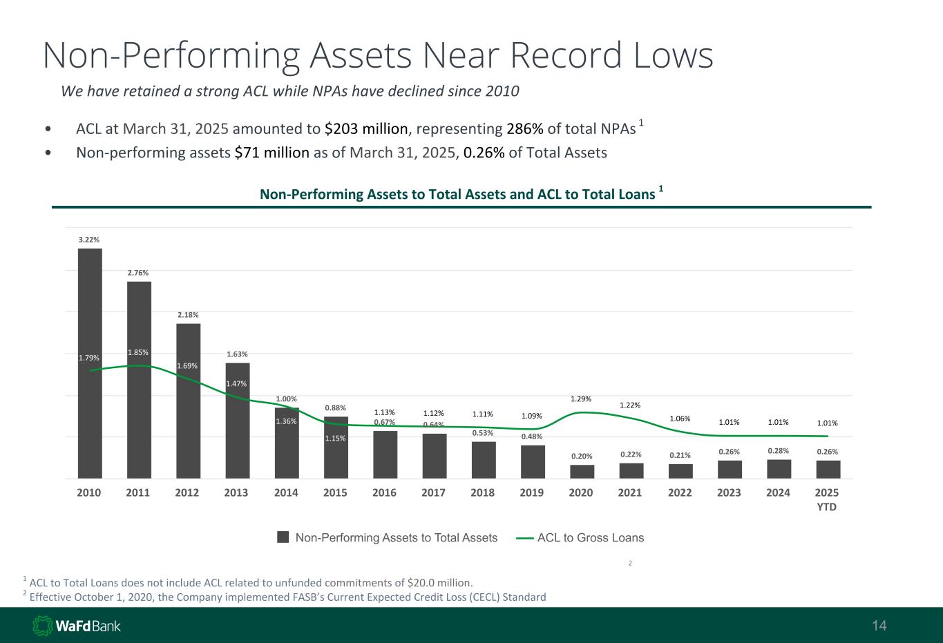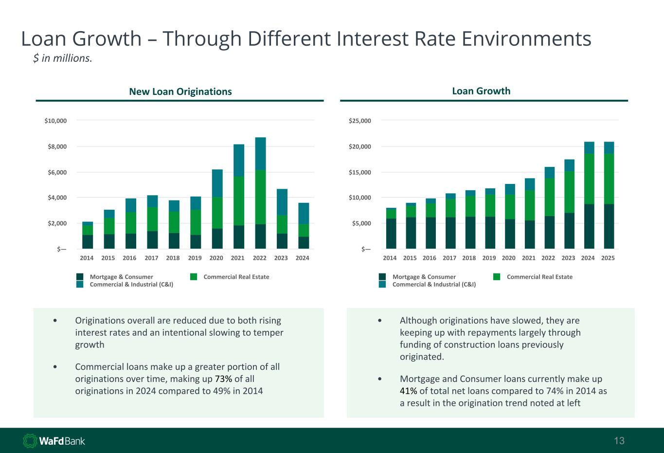 13 Loan Growth – Through Different Interest Rate Environments • Although originations have slowed, they are keeping up with repayments largely through funding of construction loans previously originated. • Mortgage and Consumer loans currently make up 41% of total net loans compared to 74% in 2014 as a result in the origination trend noted at left Loan GrowthNew Loan Originations $ in millions. • Originations overall are reduced due to both rising interest rates and an intentional slowing to temper growth • Commercial loans make up a greater portion of all originations over time, making up 73% of all originations in 2024 compared to 49% in 2014 Mortgage & Consumer Commercial Real Estate Commercial & Industrial (C&I) 2014 2015 2016 2017 2018 2019 2020 2021 2022 2023 2024 $— $2,000 $4,000 $6,000 $8,000 $10,000 Mortgage & Consumer Commercial Real Estate Commercial & Industrial (C&I) 2014 2015 2016 2017 2018 2019 2020 2021 2022 2023 2024 2025 $— $5,000 $10,000 $15,000 $20,000 $25,000