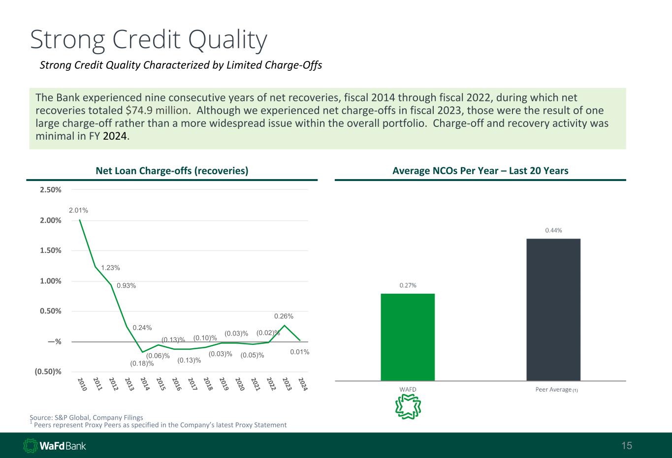 Non-Performing Assets Near Record Lows 14 We have retained a strong ACL while NPAs have declined since 2010 • ACL at March 31, 2025 amounted to $203 million, representing 286% of total NPAs 1 • Non-performing assets $71 million as of March 31, 2025, 0.26% of Total Assets Non-Performing Assets to Total Assets and ACL to Total Loans 1 1 ACL to Total Loans does not include ACL related to unfunded commitments of $20.0 million. 2 Effective October 1, 2020, the Company implemented FASB’s Current Expected Credit Loss (CECL) Standard 2 3.22% 2.76% 2.18% 1.63% 1.00% 0.88% 0.67% 0.64% 0.53% 0.48% 0.20% 0.22% 0.21% 0.26% 0.28% 0.26% 1.79% 1.85% 1.69% 1.47% 1.36% 1.15% 1.13% 1.12% 1.11% 1.09% 1.29% 1.22% 1.06% 1.01% 1.01% 1.01% Non-Performing Assets to Total Assets ACL to Gross Loans 2010 2011 2012 2013 2014 2015 2016 2017 2018 2019 2020 2021 2022 2023 2024 2025 YTD