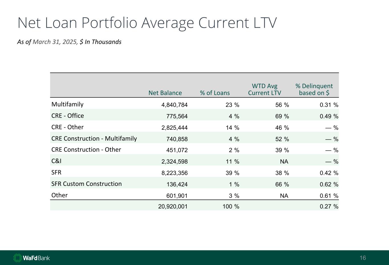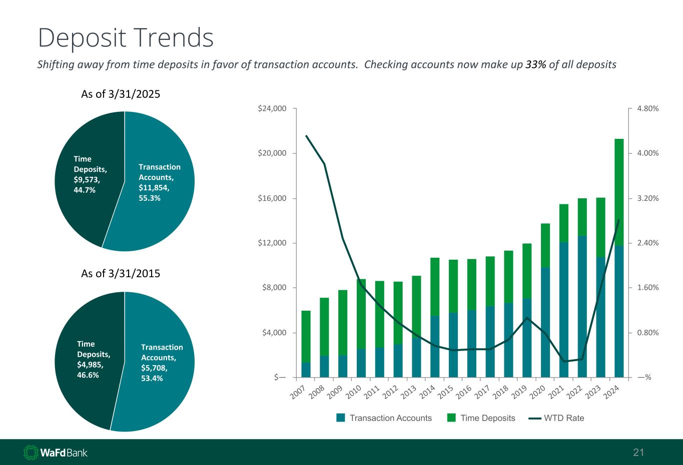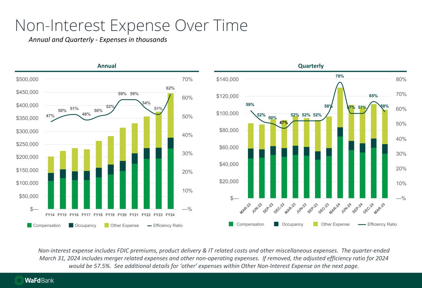 Non-Interest Income 30 Diverse sources of Non-Interest Income provide steady growth and balance our revenue profile Non-Interest Income for Quarter-Ended March 31, 2025 Non-Interest Income Over Time ($MM) Non-Interest Income / Total Loan Revenue Other Income includes: • BOLI income • Rental income • Gains on property sales • WAFD Insurance Income • Income on equity method investments Loan Fees, 9.6% Deposit Fees, 37.4% Other Income, 52.9% 11% 9% 11% 16% 12% 10% 6% 5% FY 2017 FY 2018 FY 2019 FY 2020 FY 2021 FY 2022 FY 2023 FY 2024 $4.3 $3.8 $3.9 $7.3 $6.9 $7.2 $3.9 $22.6 $25.9 $24.9 $23.7 $24.7 $25.9 $26.1 $27.5 $23.2 $14.7 $23.3 $24.1 $28.6 $33.2 $23.1 $29.9 $3.5 $10.1 $30.7 Loan Fees Deposit Fees Other Income Gain on Sale of Investments Gain on Sale of Buildings FY 2017 FY 2018 FY 2019 FY 2020 FY 2021 FY 2022 FY 2023 FY 2024