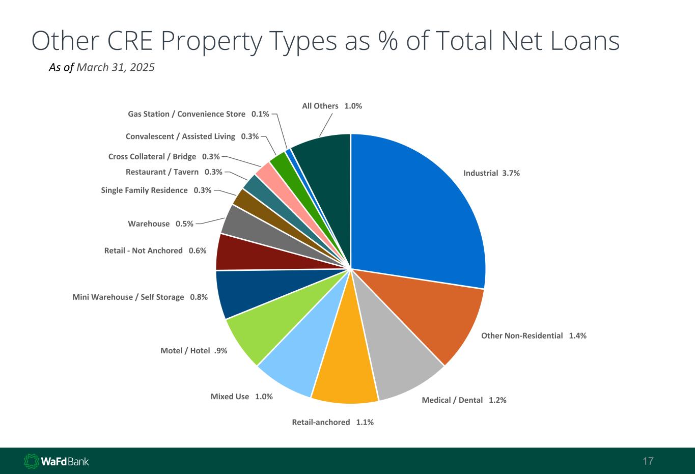 Net Loan Portfolio Average Current LTV 16 As of March 31, 2025, $ In Thousands Net Balance % of Loans WTD Avg Current LTV % Delinquent based on $ Multifamily 4,840,784 23 % 56 % 0.31 % CRE - Office 775,564 4 % 69 % 0.49 % CRE - Other 2,825,444 14 % 46 % — % CRE Construction - Multifamily 740,858 4 % 52 % — % CRE Construction - Other 451,072 2 % 39 % — % C&I 2,324,598 11 % NA — % SFR 8,223,356 39 % 38 % 0.42 % SFR Custom Construction 136,424 1 % 66 % 0.62 % Other 601,901 3 % NA 0.61 % 20,920,001 100 % 0.27 %