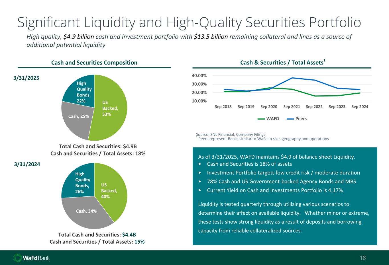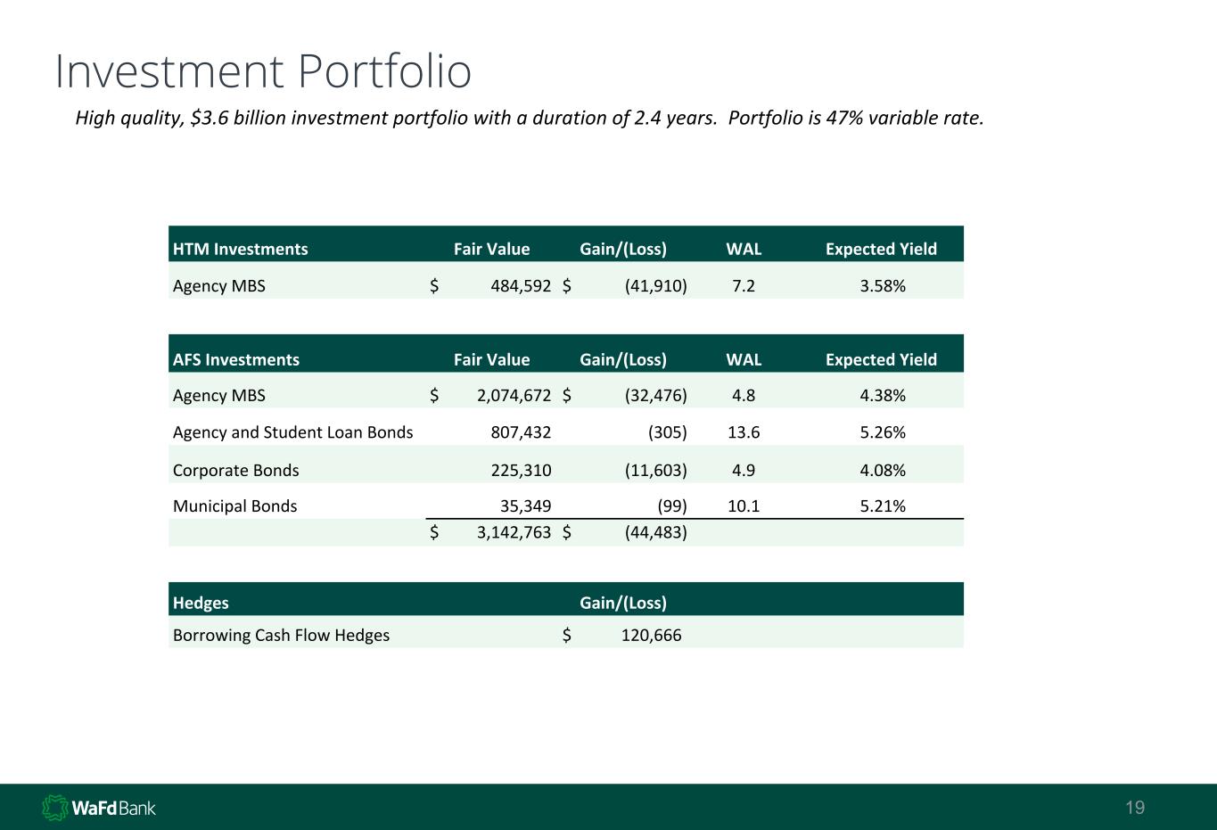 Significant Liquidity and High-Quality Securities Portfolio 18 High quality, $4.9 billion cash and investment portfolio with $13.5 billion remaining collateral and lines as a source of additional potential liquidity Cash and Securities Composition Total Cash and Securities: $4.9B Cash and Securities / Total Assets: 18% Cash & Securities / Total Assets1 As of 3/31/2025, WAFD maintains $4.9 of balance sheet Liquidity. • Cash and Securities is 18% of assets • Investment Portfolio targets low credit risk / moderate duration • 78% Cash and US Government-backed Agency Bonds and MBS • Current Yield on Cash and Investments Portfolio is 4.17% Liquidity is tested quarterly through utilizing various scenarios to determine their affect on available liquidity. Whether minor or extreme, these tests show strong liquidity as a result of deposits and borrowing capacity from reliable collateralized sources. Source: SNL Financial, Company Filings 1 Peers represent Banks similar to WaFd in size, geography and operations Total Cash and Securities: $4.4B Cash and Securities / Total Assets: 15% 3/31/2024 3/31/2025 US Backed, 53%Cash, 25% High Quality Bonds, 22% US Backed, 40% Cash, 34% High Quality Bonds, 26% WAFD Peers Sep 2018 Sep 2019 Sep 2020 Sep 2021 Sep 2022 Sep 2023 Sep 2024 10.00% 20.00% 30.00% 40.00%