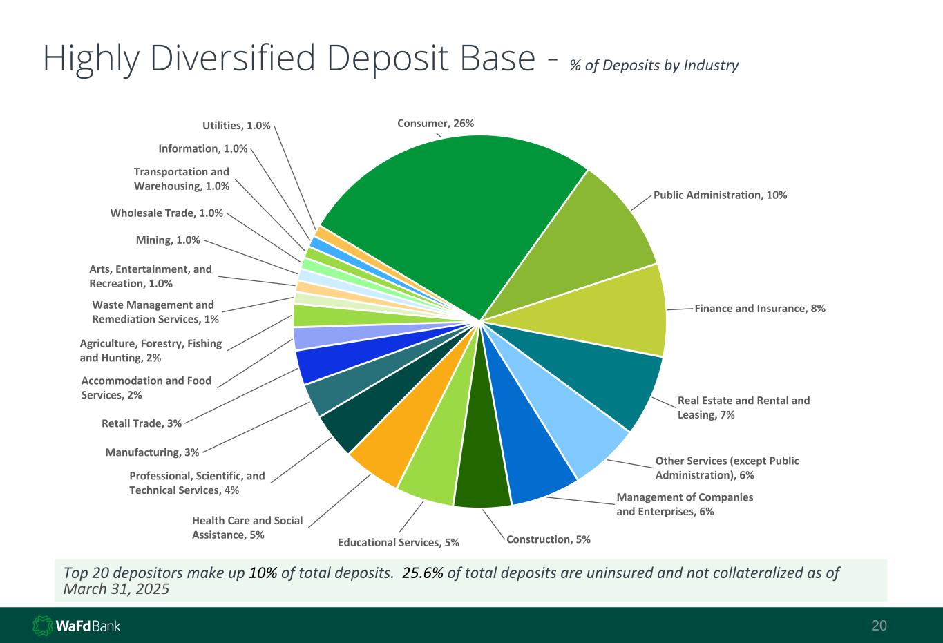 Highly Diversified Deposit Base - % of Deposits by Industry 20 Top 20 depositors make up 10% of total deposits. 25.6% of total deposits are uninsured and not collateralized as of March 31, 2025 Consumer, 26% Public Administration, 10% Finance and Insurance, 8% Real Estate and Rental and Leasing, 7% Other Services (except Public Administration), 6% Management of Companies and Enterprises, 6% Construction, 5%Educational Services, 5% Health Care and Social Assistance, 5% Professional, Scientific, and Technical Services, 4% Manufacturing, 3% Retail Trade, 3% Accommodation and Food Services, 2% Agriculture, Forestry, Fishing and Hunting, 2% Waste Management and Remediation Services, 1% Arts, Entertainment, and Recreation, 1.0% Mining, 1.0% Wholesale Trade, 1.0% Transportation and Warehousing, 1.0% Information, 1.0% Utilities, 1.0%