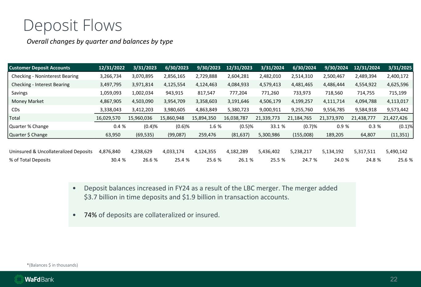 21 Deposit Trends Shifting away from time deposits in favor of transaction accounts. Checking accounts now make up 33% of all deposits Transaction Accounts, $11,854, 55.3% Time Deposits, $9,573, 44.7% Transaction Accounts, $5,708, 53.4% Time Deposits, $4,985, 46.6% As of 3/31/2025 As of 3/31/2015 Transaction Accounts Time Deposits WTD Rate 20 07 20 08 20 09 20 10 20 11 20 12 20 13 20 14 20 15 20 16 20 17 20 18 20 19 20 20 20 21 20 22 20 23 20 24 $— $4,000 $8,000 $12,000 $16,000 $20,000 $24,000 —% 0.80% 1.60% 2.40% 3.20% 4.00% 4.80%