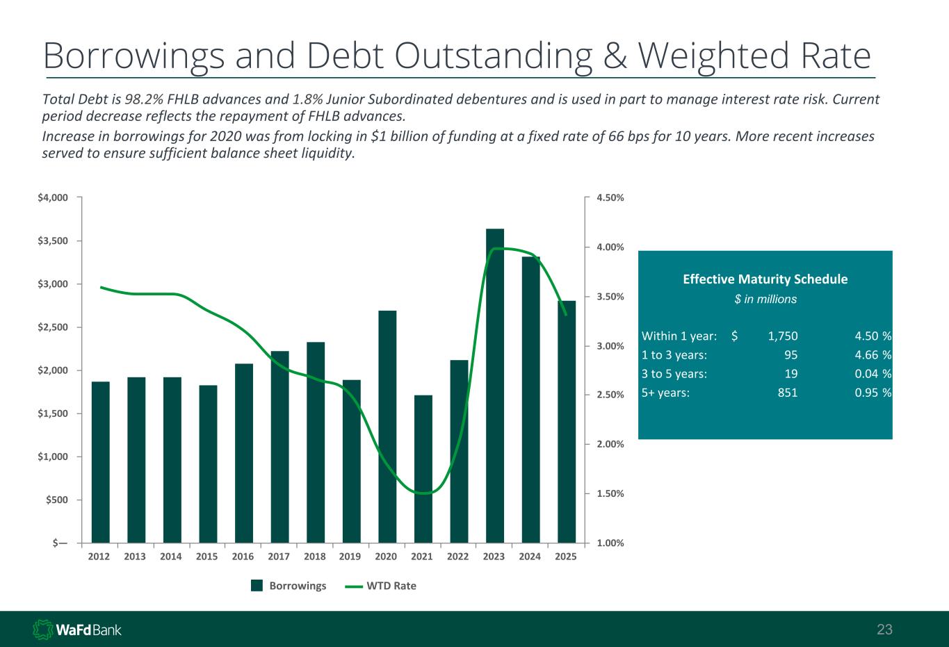 22 Deposit Flows *(Balances $ in thousands) • Deposit balances increased in FY24 as a result of the LBC merger. The merger added $3.7 billion in time deposits and $1.9 billion in transaction accounts. • 74% of deposits are collateralized or insured. Overall changes by quarter and balances by type Customer Deposit Accounts 12/31/2022 3/31/2023 6/30/2023 9/30/2023 12/31/2023 3/31/2024 6/30/2024 9/30/2024 12/31/2024 3/31/2025 Checking - Noninterest Bearing 3,266,734 3,070,895 2,856,165 2,729,888 2,604,281 2,482,010 2,514,310 2,500,467 2,489,394 2,400,172 Checking - Interest Bearing 3,497,795 3,971,814 4,125,554 4,124,463 4,084,933 4,579,413 4,481,465 4,486,444 4,554,922 4,625,596 Savings 1,059,093 1,002,034 943,915 817,547 777,204 771,260 733,973 718,560 714,755 715,199 Money Market 4,867,905 4,503,090 3,954,709 3,358,603 3,191,646 4,506,179 4,199,257 4,111,714 4,094,788 4,113,017 CDs 3,338,043 3,412,203 3,980,605 4,863,849 5,380,723 9,000,911 9,255,760 9,556,785 9,584,918 9,573,442 Total 16,029,570 15,960,036 15,860,948 15,894,350 16,038,787 21,339,773 21,184,765 21,373,970 21,438,777 21,427,426 Quarter % Change 0.4 % (0.4) % (0.6) % 1.6 % (0.5) % 33.1 % (0.7) % 0.9 % 0.3 % (0.1) % Quarter $ Change 63,950 (69,535) (99,087) 259,476 (81,637) 5,300,986 (155,008) 189,205 64,807 (11,351) Uninsured & Uncollateralized Deposits 4,876,840 4,238,629 4,033,174 4,124,355 4,182,289 5,436,402 5,238,217 5,134,192 5,317,511 5,490,142 % of Total Deposits 30.4 % 26.6 % 25.4 % 25.6 % 26.1 % 25.5 % 24.7 % 24.0 % 24.8 % 25.6 %