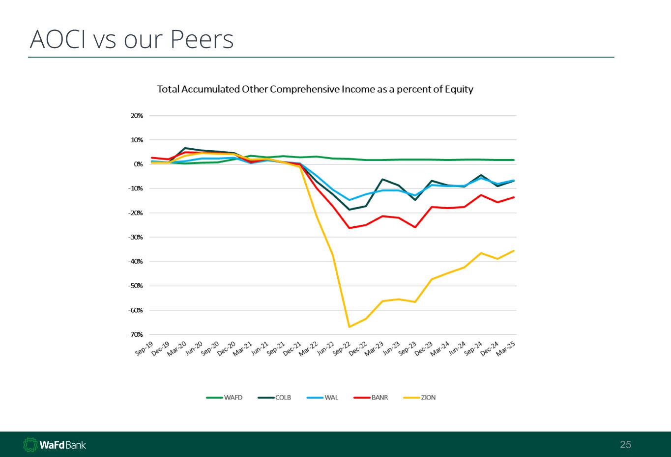 Cost of Deposits in the Rising Rate Environment 24 0.23% 0.42% 0.79% 1.34% 1.77% 2.07% 2.42% 2.65% 2.95% 3.11% 3.02% 2.89% 0.94% 2.35% 3.82% 4.64% 5.07% 5.40% 5.40% 5.40% 5.40% 5.33% 4.71% 4.50% Cost of All Deposits Avg Fed Funds (Upper) Jun-22 Sep-22 Dec-22 Mar-23 Jun-23 Sep-23 Dec-23 Mar-24 Jun-24 Sep-24 Dec-24 Mar-25 —% 1.00% 2.00% 3.00% 4.00% 5.00% 6.00%