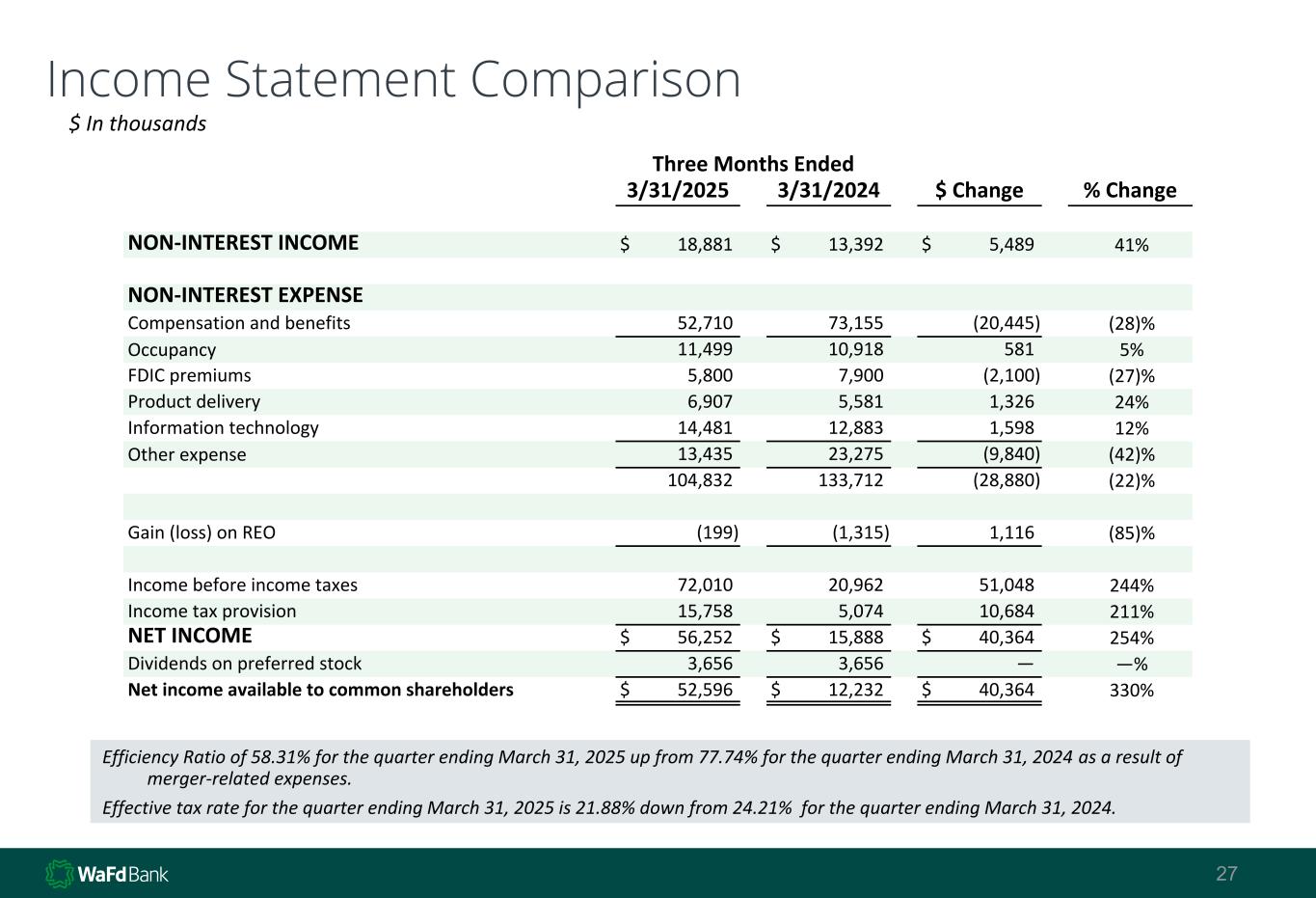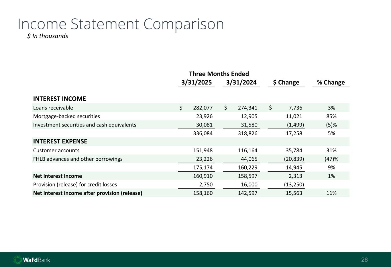 26 Income Statement Comparison 26 $ In thousands Three Months Ended 3/31/2025 3/31/2024 $ Change % Change INTEREST INCOME Loans receivable $ 282,077 $ 274,341 $ 7,736 3% Mortgage-backed securities 23,926 12,905 11,021 85% Investment securities and cash equivalents 30,081 31,580 (1,499) (5)% 336,084 318,826 17,258 5% INTEREST EXPENSE Customer accounts 151,948 116,164 35,784 31% FHLB advances and other borrowings 23,226 44,065 (20,839) (47)% 175,174 160,229 14,945 9% Net interest income 160,910 158,597 2,313 1% Provision (release) for credit losses 2,750 16,000 (13,250) Net interest income after provision (release) 158,160 142,597 15,563 11%