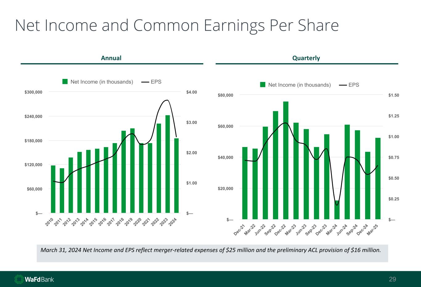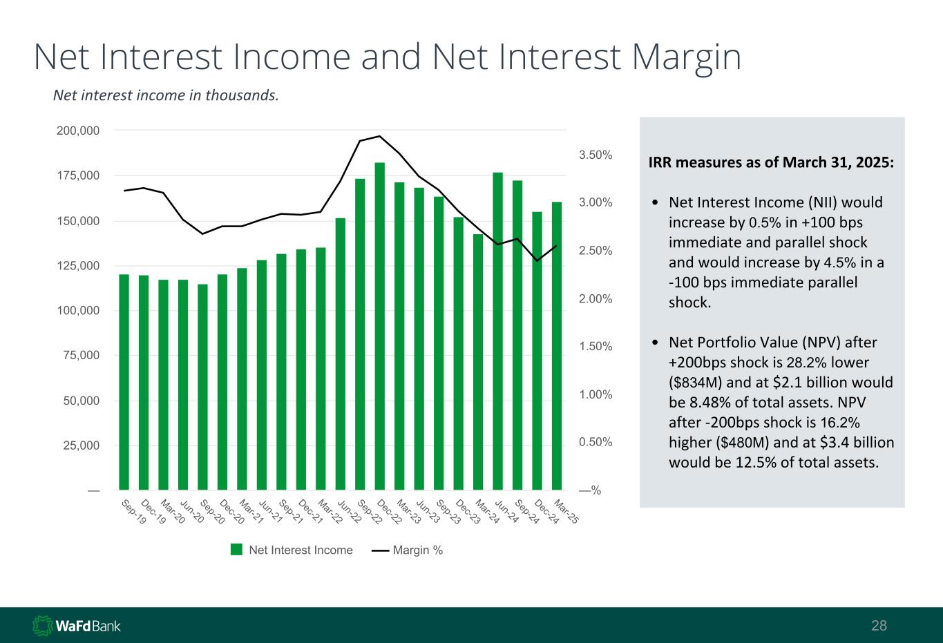 28 Net Interest Income and Net Interest Margin Net interest income in thousands. IRR measures as of March 31, 2025: • Net Interest Income (NII) would increase by 0.5% in +100 bps immediate and parallel shock and would increase by 4.5% in a -100 bps immediate parallel shock. • Net Portfolio Value (NPV) after +200bps shock is 28.2% lower ($834M) and at $2.1 billion would be 8.48% of total assets. NPV after -200bps shock is 16.2% higher ($480M) and at $3.4 billion would be 12.5% of total assets. Net Interest Income Margin % Sep-19 Dec-19 Mar-20 Jun-20 Sep-20 Dec-20 Mar-21 Jun-21 Sep-21 Dec-21 Mar-22 Jun-22 Sep-22 Dec-22 Mar-23 Jun-23 Sep-23 Dec-23 Mar-24 Jun-24 Sep-24 Dec-24 Mar-25 — 25,000 50,000 75,000 100,000 125,000 150,000 175,000 200,000 —% 0.50% 1.00% 1.50% 2.00% 2.50% 3.00% 3.50%