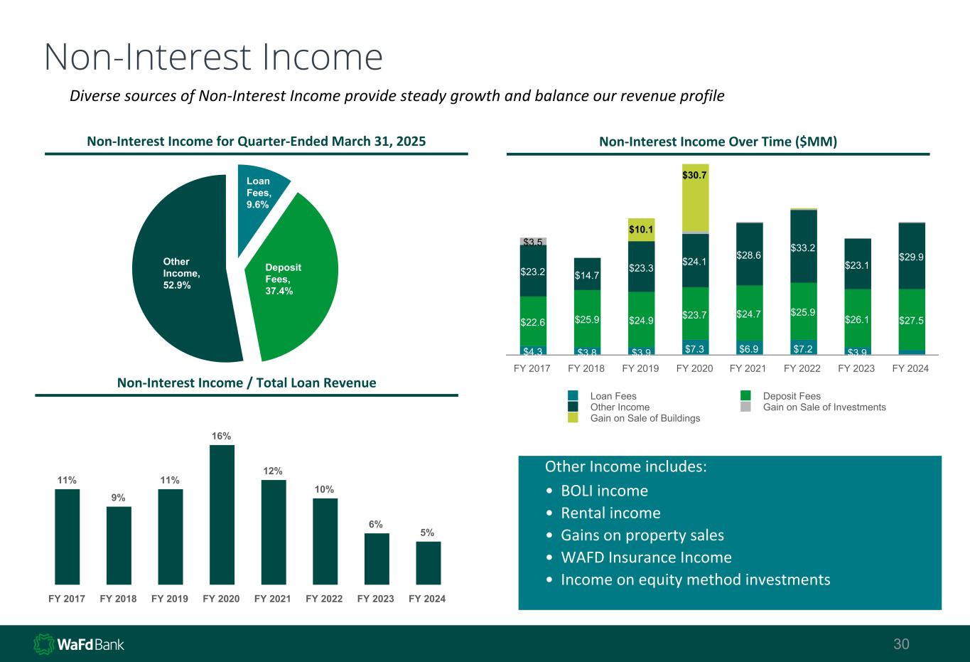 29 Net Income and Common Earnings Per Share Annual Quarterly March 31, 2024 Net Income and EPS reflect merger-related expenses of $25 million and the preliminary ACL provision of $16 million. Net Income (in thousands) EPS 20 10 20 11 20 12 20 13 20 14 20 15 20 16 20 17 20 18 20 19 20 20 20 21 20 22 20 23 20 24 $— $60,000 $120,000 $180,000 $240,000 $300,000 $— $1.00 $2.00 $3.00 $4.00 Net Income (in thousands) EPS Dec -21 Mar- 22 Ju n-22 Sep -22 Dec -22 Mar- 23 Ju n-23 Sep -23 Dec -23 Mar- 24 Ju n-24 Sep -24 Dec -24 Mar- 25 $— $20,000 $40,000 $60,000 $80,000 $— $0.25 $0.50 $0.75 $1.00 $1.25 $1.50