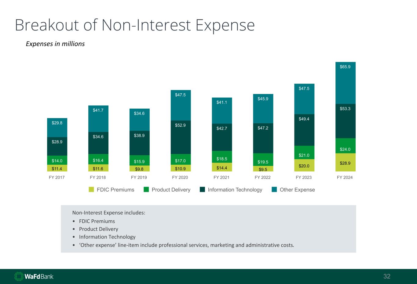 31 Non-Interest Expense Over Time Annual and Quarterly - Expenses in thousands Annual Quarterly Non-interest expense includes FDIC premiums, product delivery & IT related costs and other miscellaneous expenses. The quarter-ended March 31, 2024 includes merger related expenses and other non-operating expenses. If removed, the adjusted efficiency ratio for 2024 would be 57.5%. See additional details for ‘other’ expenses within Other Non-Interest Expense on the next page. 47% 50% 51% 48% 50% 52% 59% 59% 54% 51% 62% Compensation Occupancy Other Expense Efficiency Ratio FY14 FY15 FY16 FY17 FY18 FY19 FY20 FY21 FY22 FY23 FY24 $— $50,000 $100,000 $150,000 $200,000 $250,000 $300,000 $350,000 $400,000 $450,000 $500,000 —% 10% 20% 30% 40% 50% 60% 70% 59% 52% 50% 47% 52% 52% 52% 58% 78% 57% 57% 65% 58% Compensation Occupancy Other Expense Efficiency Ratio MAR-22 JU N-22 SEP-22 DEC-22 MAR-23 JU N-23 SEP-23 DEC-23 MAR-24 JU N-24 SEP-24 DEC-24 MAR-25 $— $20,000 $40,000 $60,000 $80,000 $100,000 $120,000 $140,000 —% 10% 20% 30% 40% 50% 60% 70% 80%