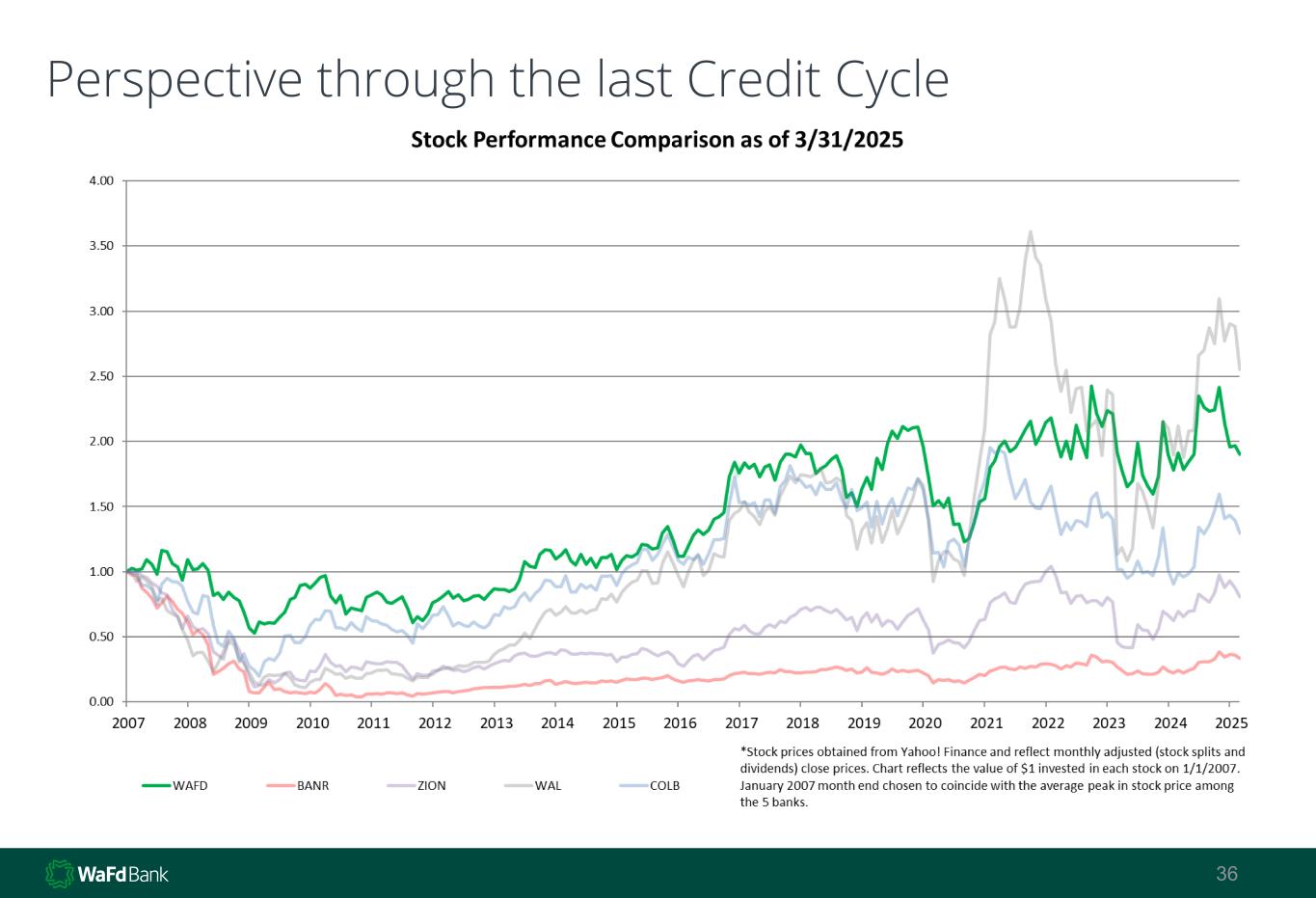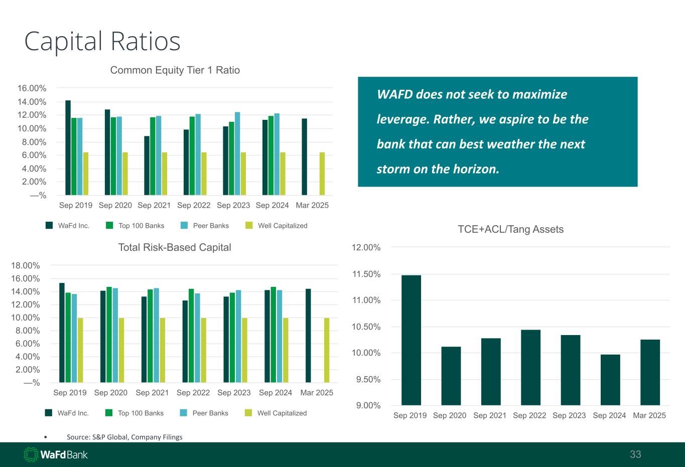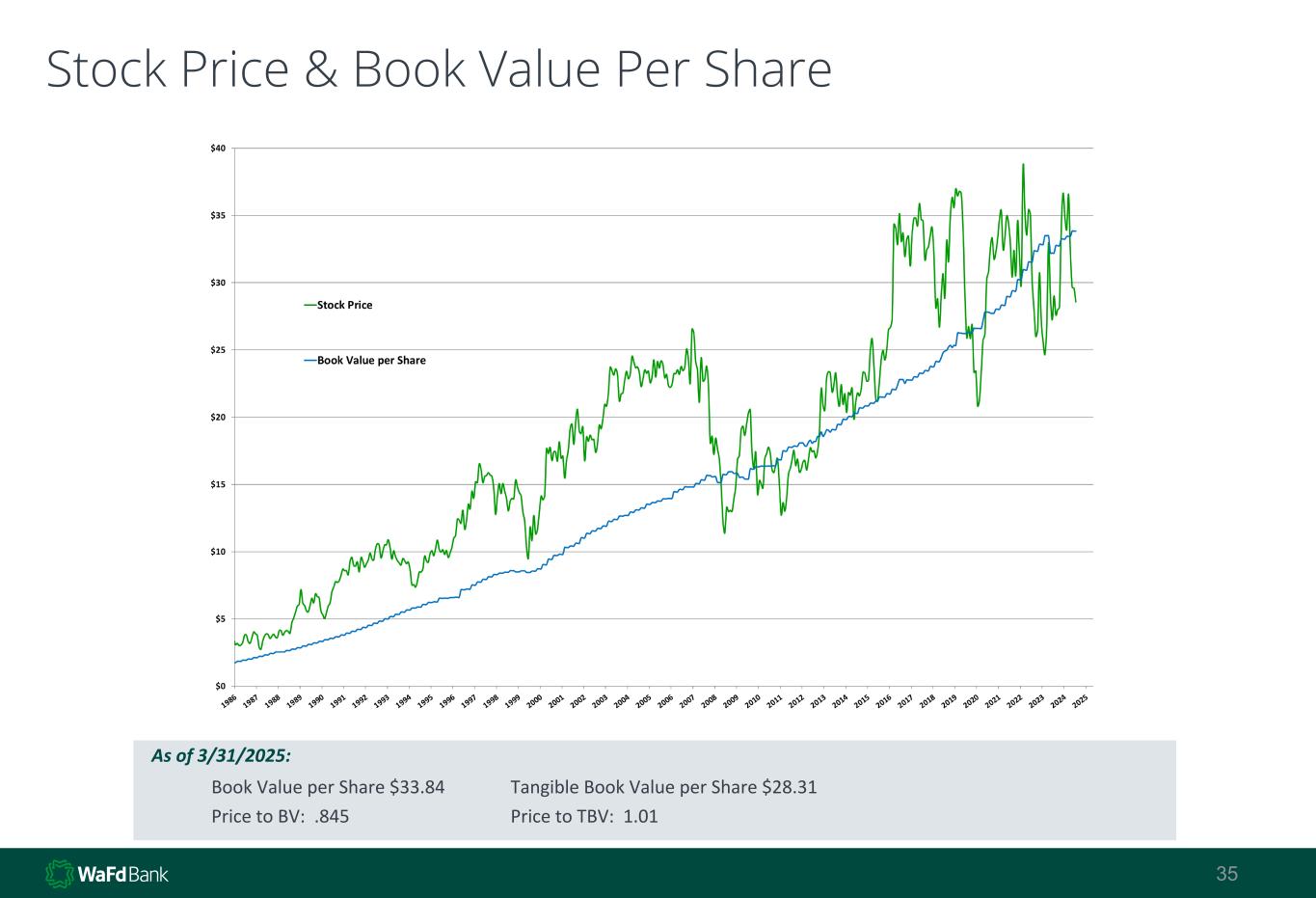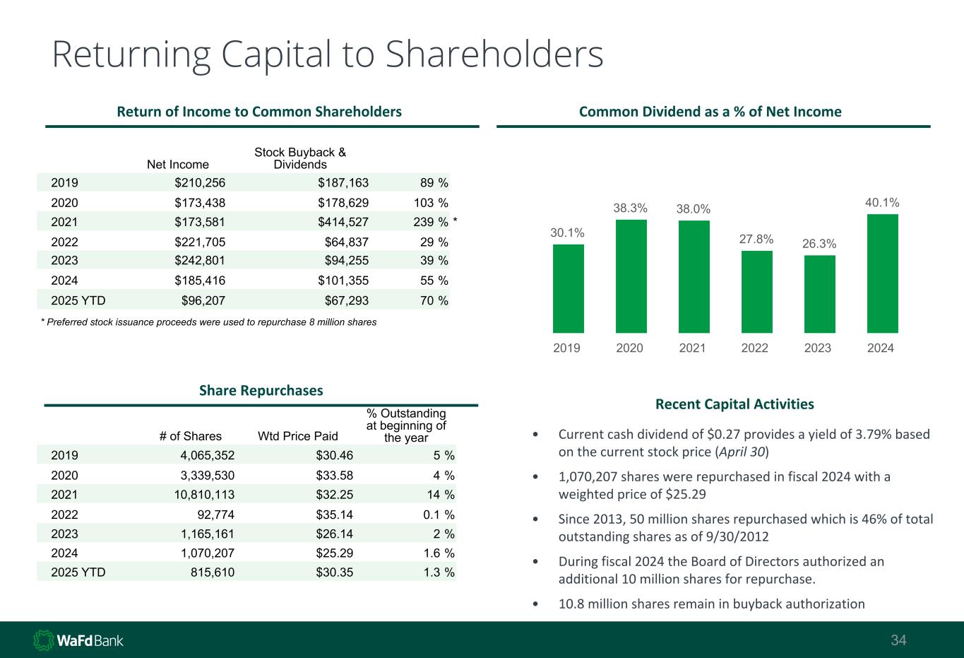 33 Capital Ratios WAFD does not seek to maximize leverage. Rather, we aspire to be the bank that can best weather the next storm on the horizon. • Source: S&P Global, Company Filings Common Equity Tier 1 Ratio WaFd Inc. Top 100 Banks Peer Banks Well Capitalized Sep 2019 Sep 2020 Sep 2021 Sep 2022 Sep 2023 Sep 2024 Mar 2025 —% 2.00% 4.00% 6.00% 8.00% 10.00% 12.00% 14.00% 16.00% Total Risk-Based Capital WaFd Inc. Top 100 Banks Peer Banks Well Capitalized Sep 2019 Sep 2020 Sep 2021 Sep 2022 Sep 2023 Sep 2024 Mar 2025 —% 2.00% 4.00% 6.00% 8.00% 10.00% 12.00% 14.00% 16.00% 18.00% TCE+ACL/Tang Assets Sep 2019 Sep 2020 Sep 2021 Sep 2022 Sep 2023 Sep 2024 Mar 2025 9.00% 9.50% 10.00% 10.50% 11.00% 11.50% 12.00%