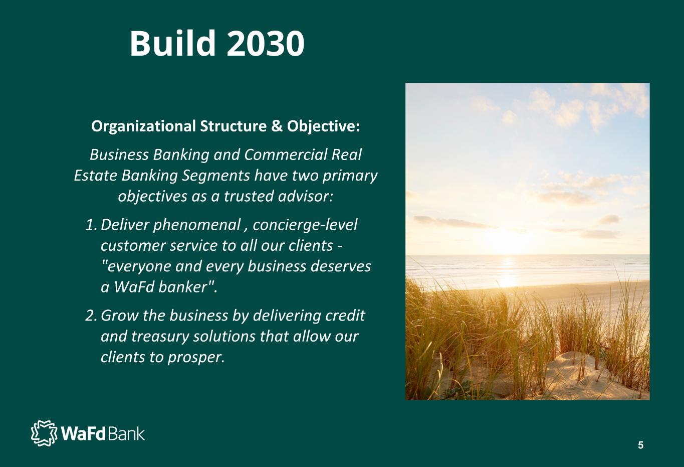 Organizational Structure & Objective: Business Banking and Commercial Real Estate Banking Segments have two primary objectives as a trusted advisor: 1.Deliver phenomenal , concierge-level customer service to all our clients - "everyone and every business deserves a WaFd banker". 2.Grow the business by delivering credit and treasury solutions that allow our clients to prosper. Build 2030 5